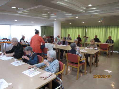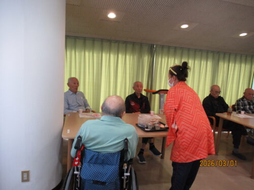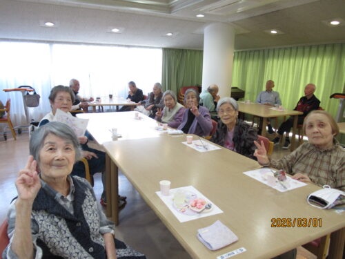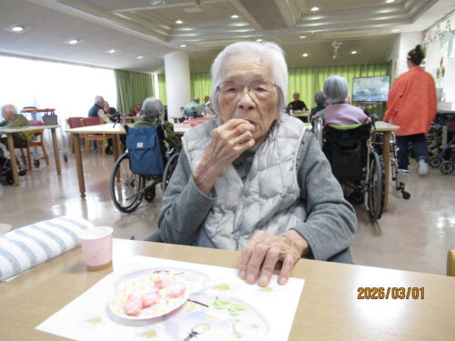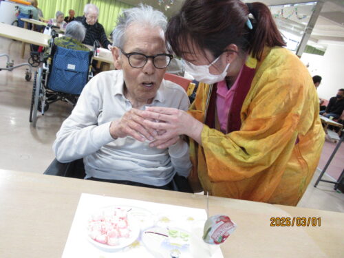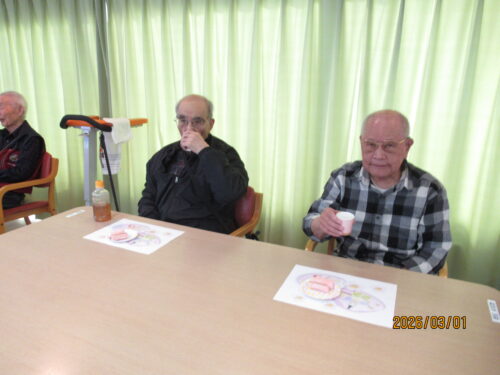 この日は天気も良く、風もあまりなかったので、外でおやつを食べて頂きました(*^_^*)土筆を見つけて取ってきたり、春の訪れを感じながら皆様とってもいい笑顔でした!!いつものおやつとは違う雰囲気で、利用者様同士で沢山お話をされていました!!また誕生日の利用者様を、皆でお祝いさせて頂きました!!とっても喜んで下さり、私達も嬉しく感じました。利用者様同士がお話したり、笑い合ったりと、とても外の空気が気持ちよく、皆で楽しい時間を過ごさせて頂きました(^O^)
