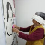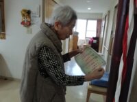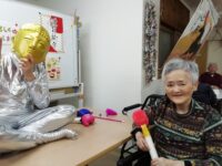 くす玉を割っていただき、大好きなネコの湯たんぽとひざかけのプレゼント。