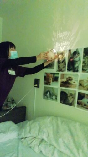 暗くしたお部屋の中に、「HAPPY BIRTHDAY」の文字をプロジェクターで映し出しました。