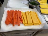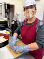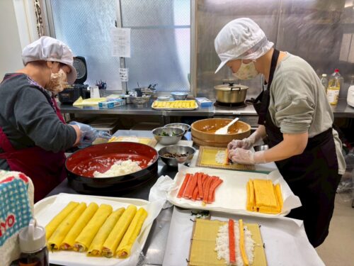 薄焼き卵を使って、破れないように、ゆっくりと巻いて
