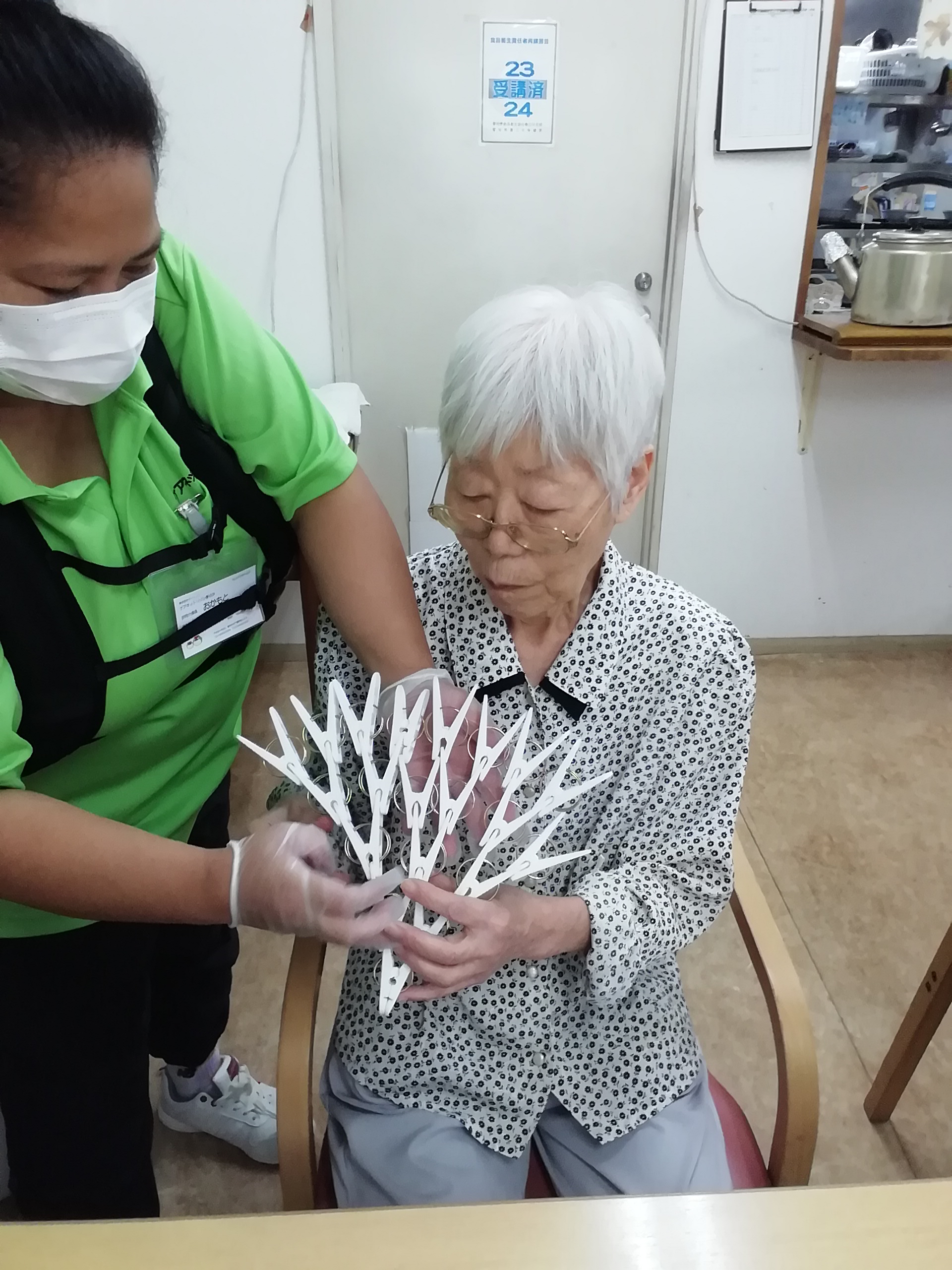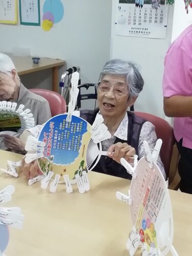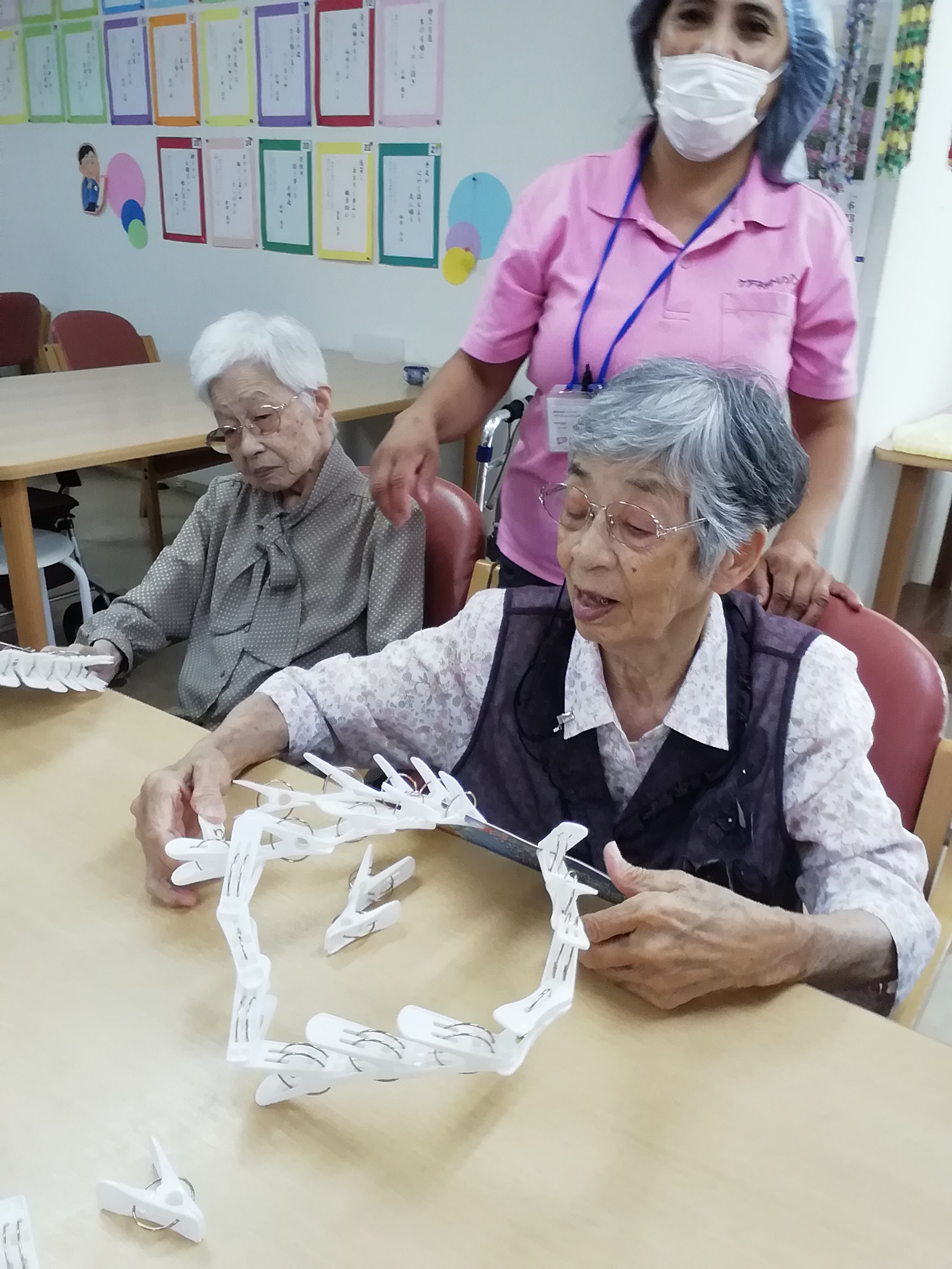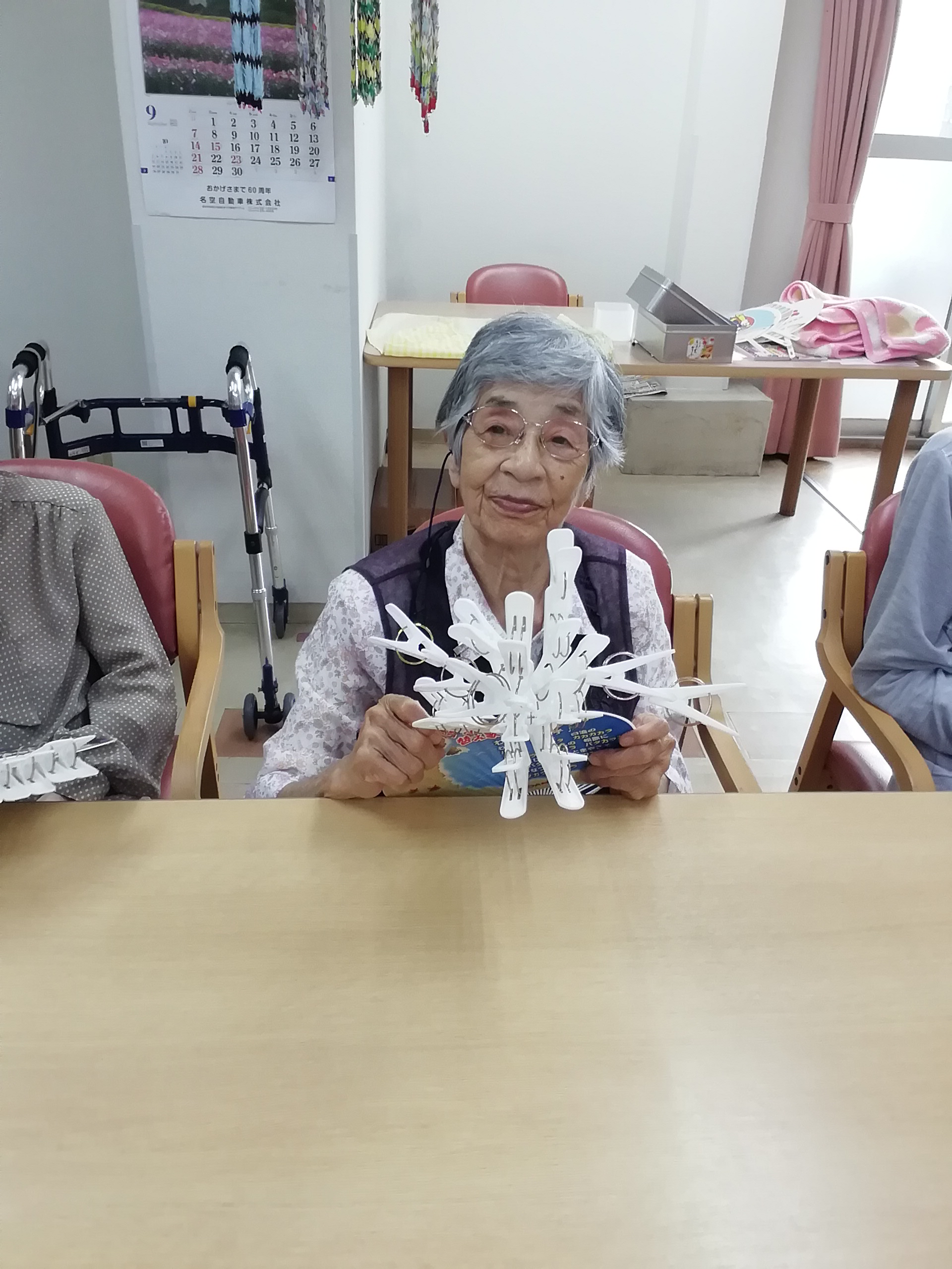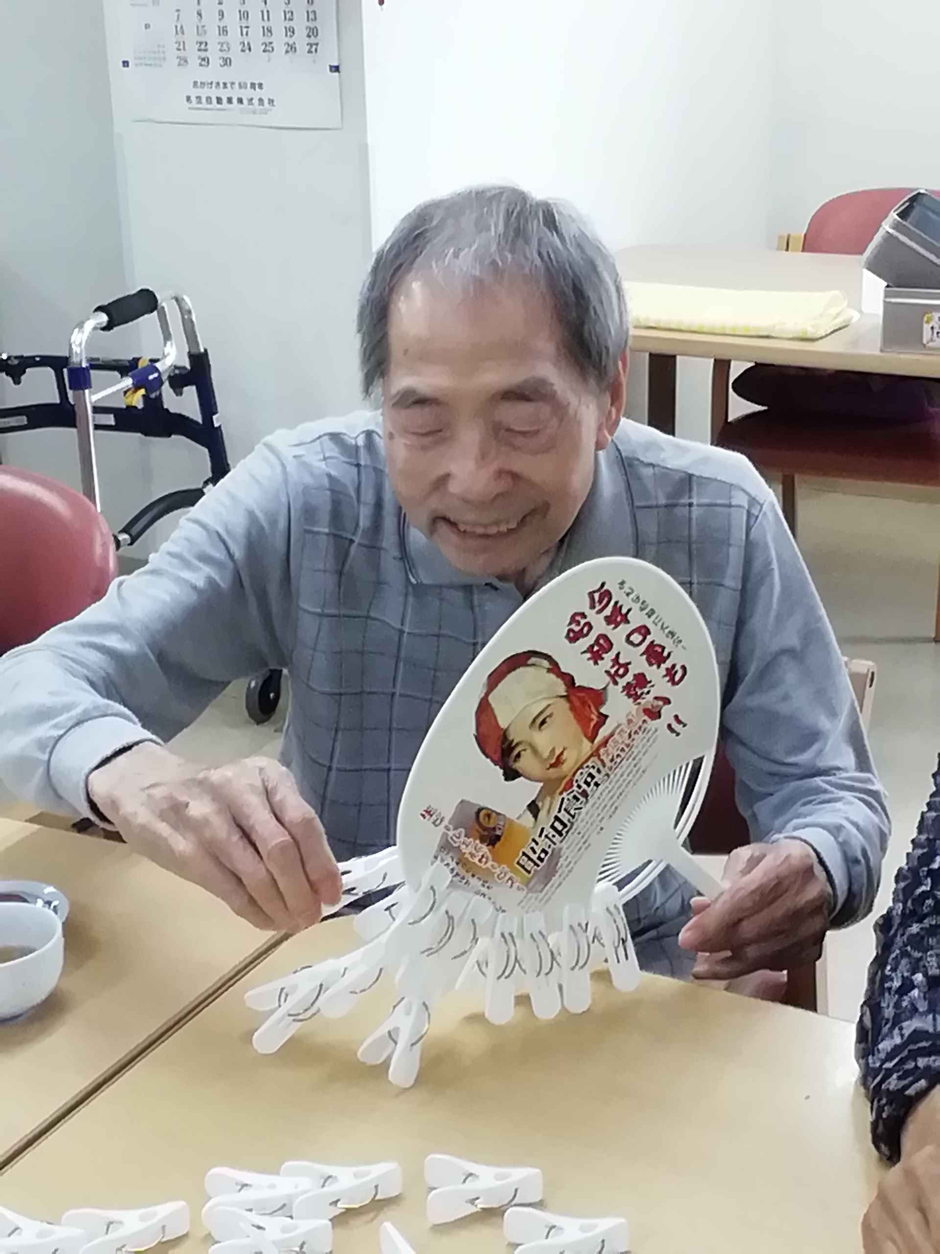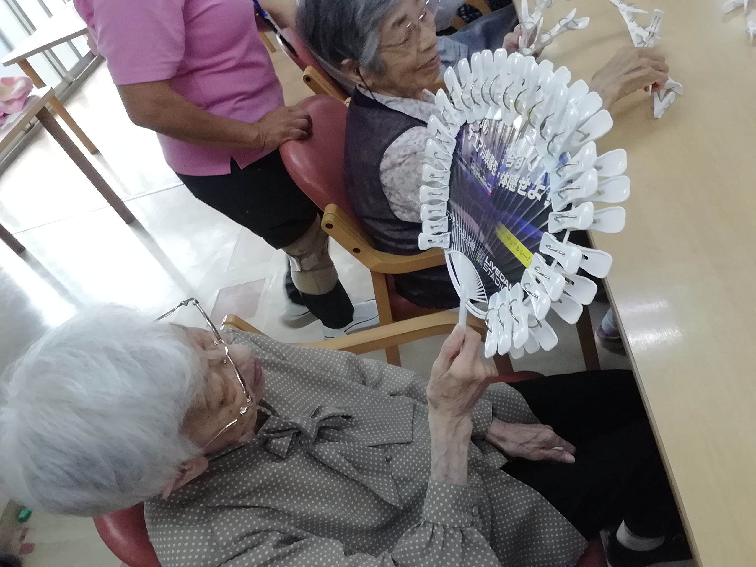 洗濯バサミをうちわにドンドンつなげていきましょう。