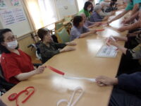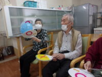 団扇に風船を挟み 隣の人に落とさないように渡します