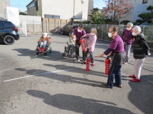 今回は、水消火器訓練も行い、実践に向けた訓練を行いました。きちんと火元から2メートルを測り消火対応。