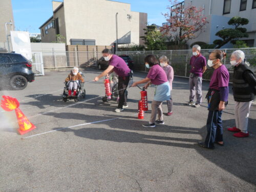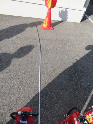 今回は、水消火器訓練も行い、実践に向けた訓練を行いました。きちんと火元から2メートルを測り消火対応。