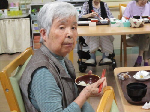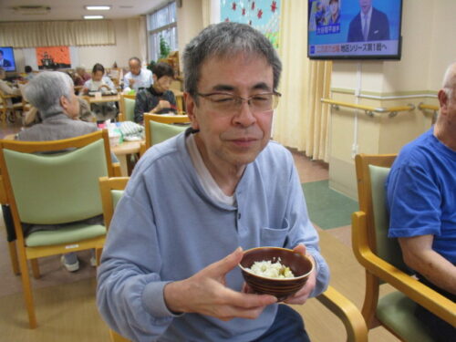 配膳されるとその栗の多さにびっくりされる利用者達。