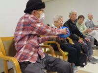 Aチーム・Bチームに分かれて横一列に座り、隣の人から渡ってきたボールを次の方に送ります。