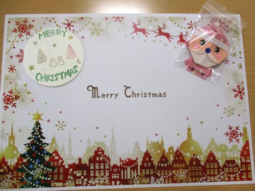 ランチョンマットと折り紙のサンタさんと一緒にテーブルへと並べていきます。