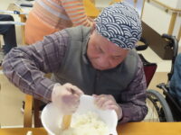 お餅は出せないですが、もち米の代わりにご飯を使って、おはぎ作りを行いました。