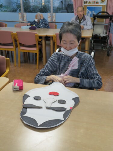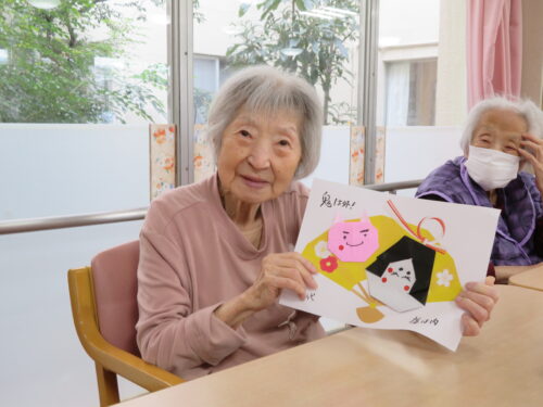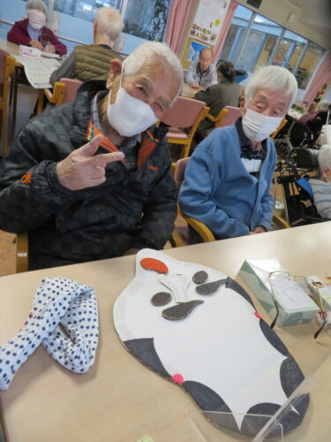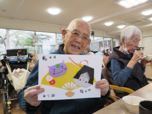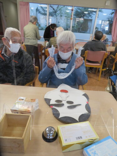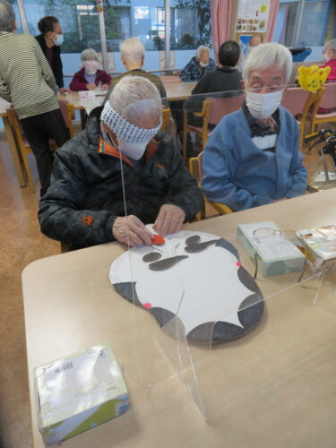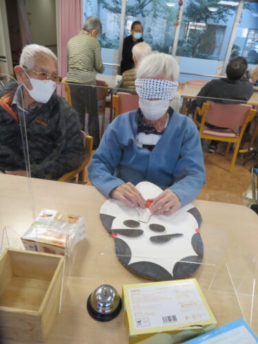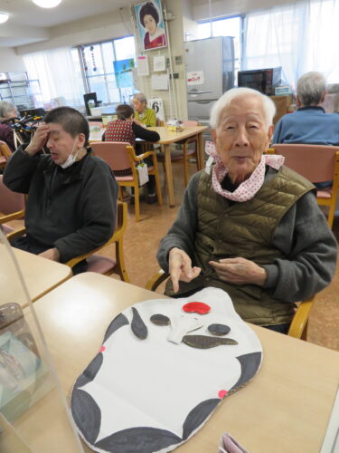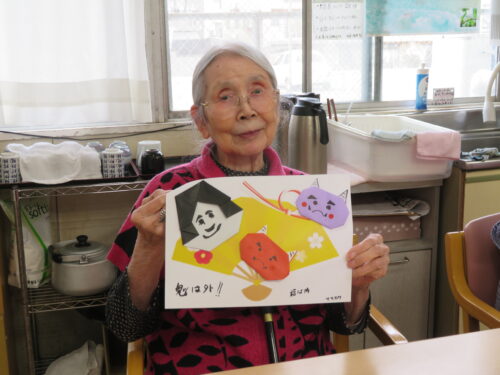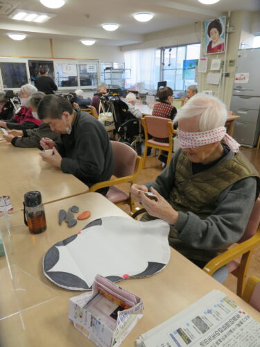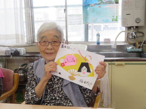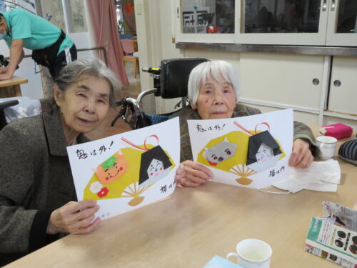 皆様のお部屋のインテリアとして、折り紙で鬼とお福さんを作り、目や口などご自身で書いていただきました。