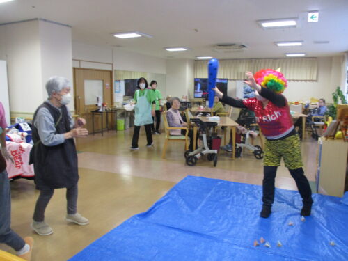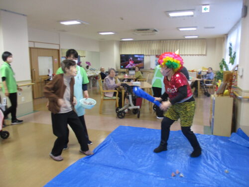 司会者の合図で利用者様たちの準備が整い、いざ豆まきへ✨