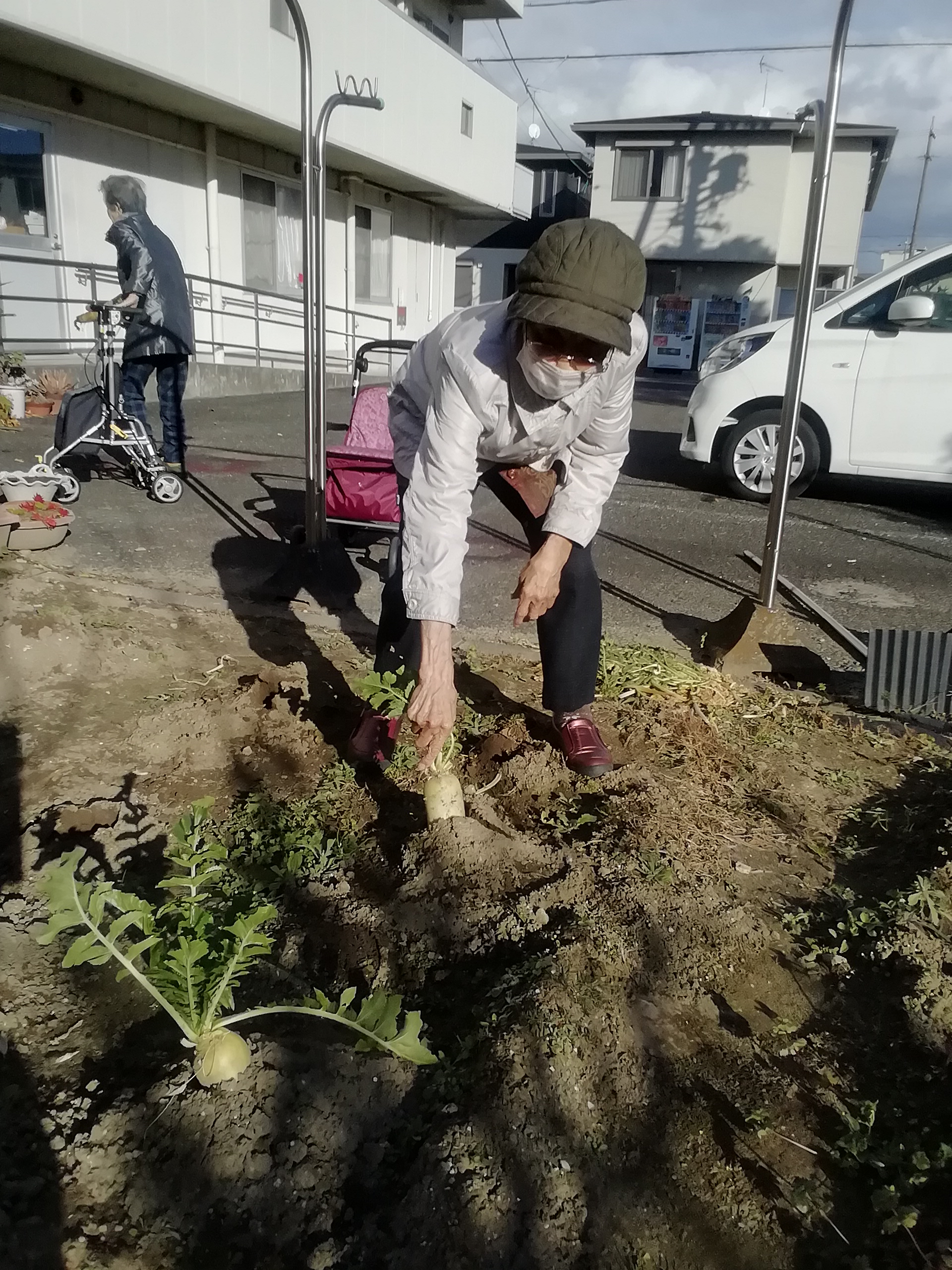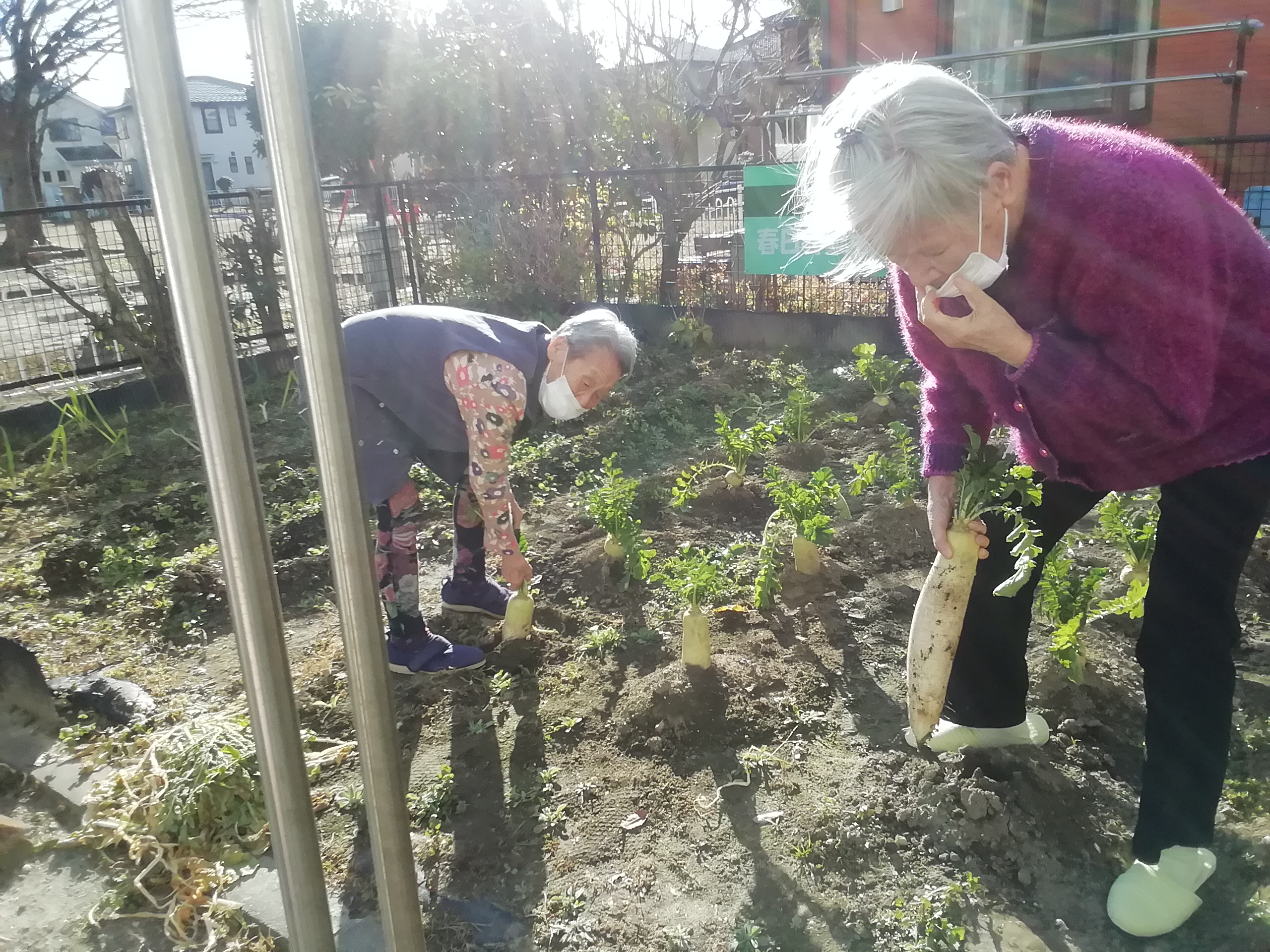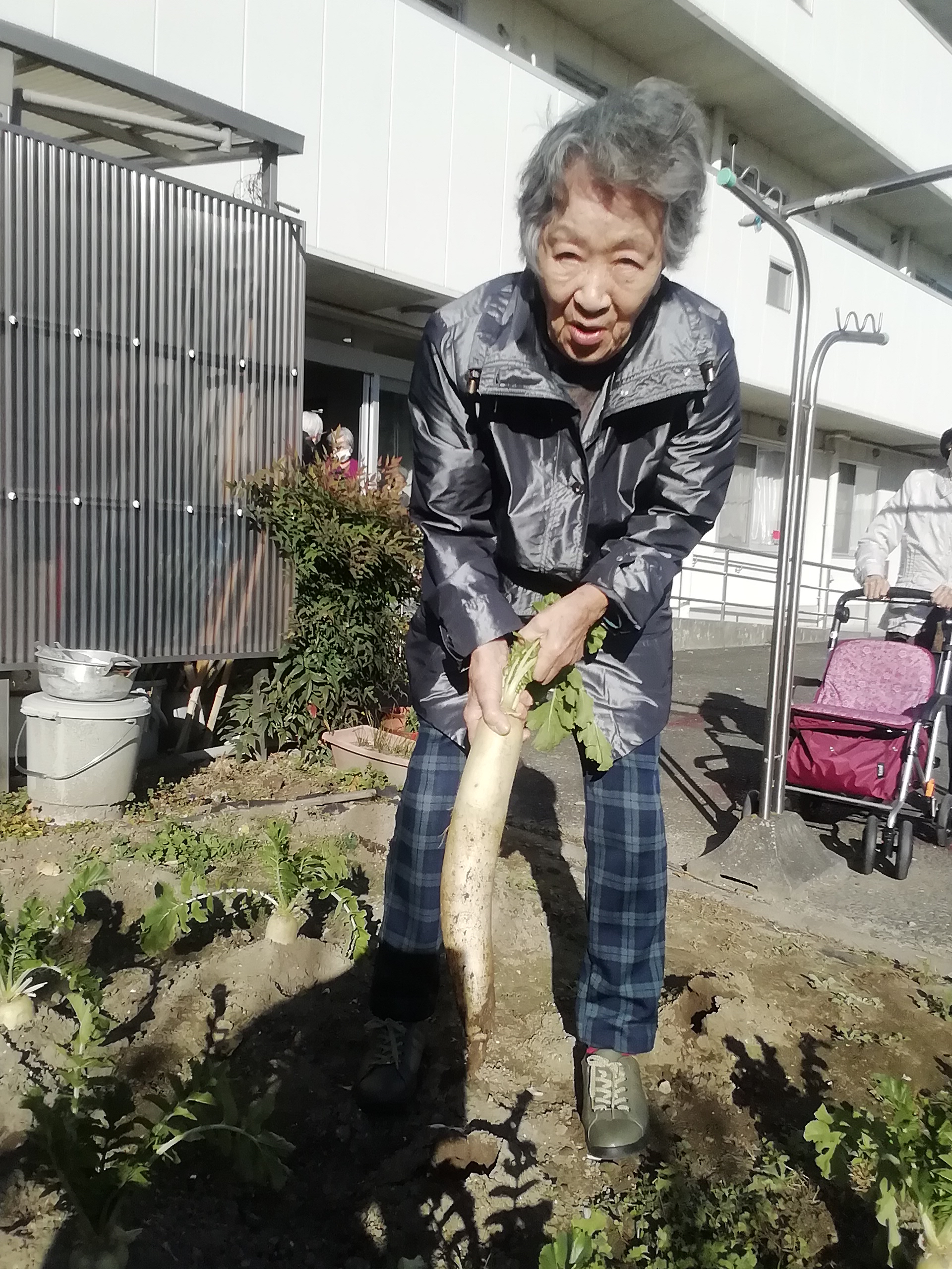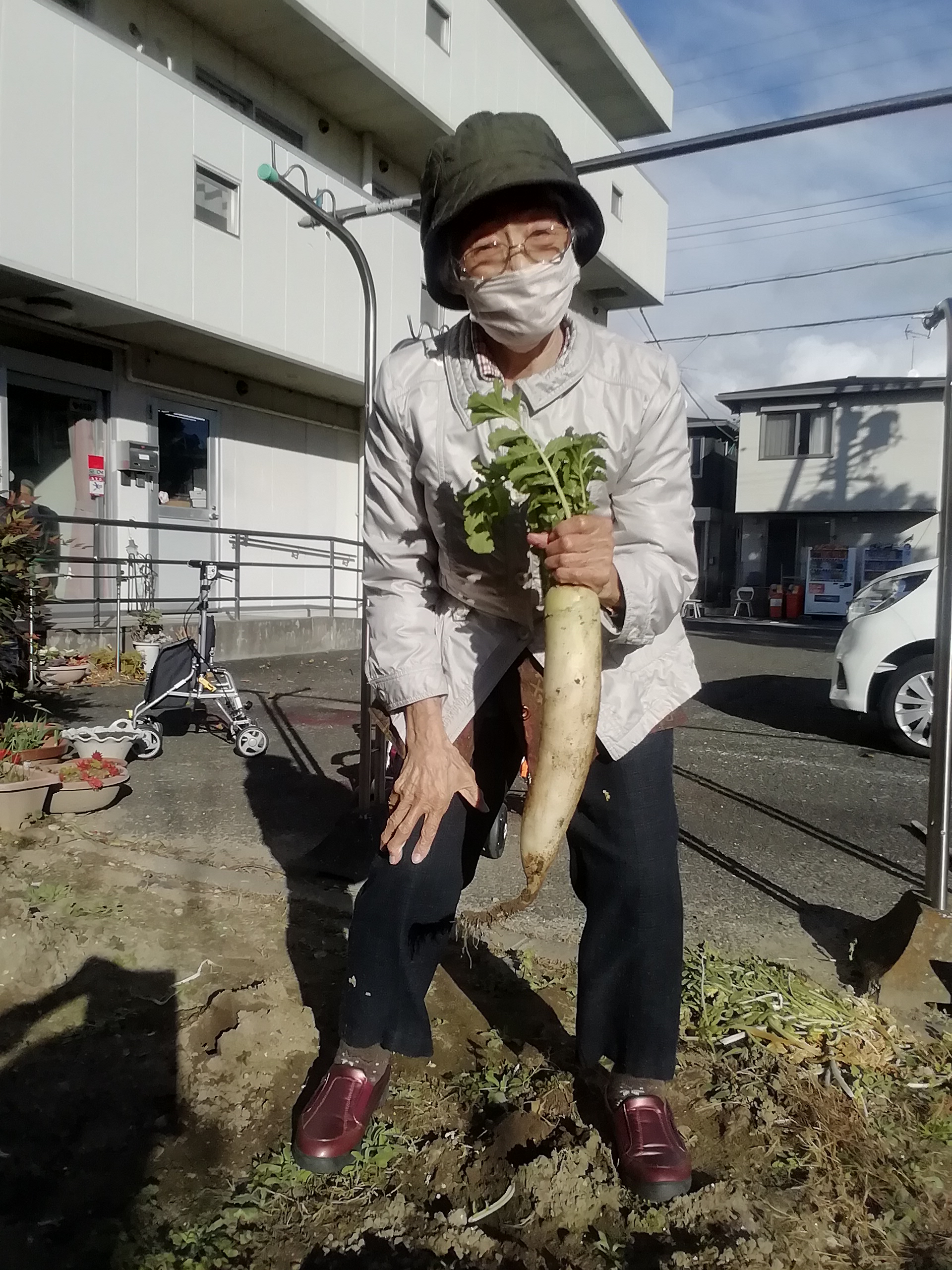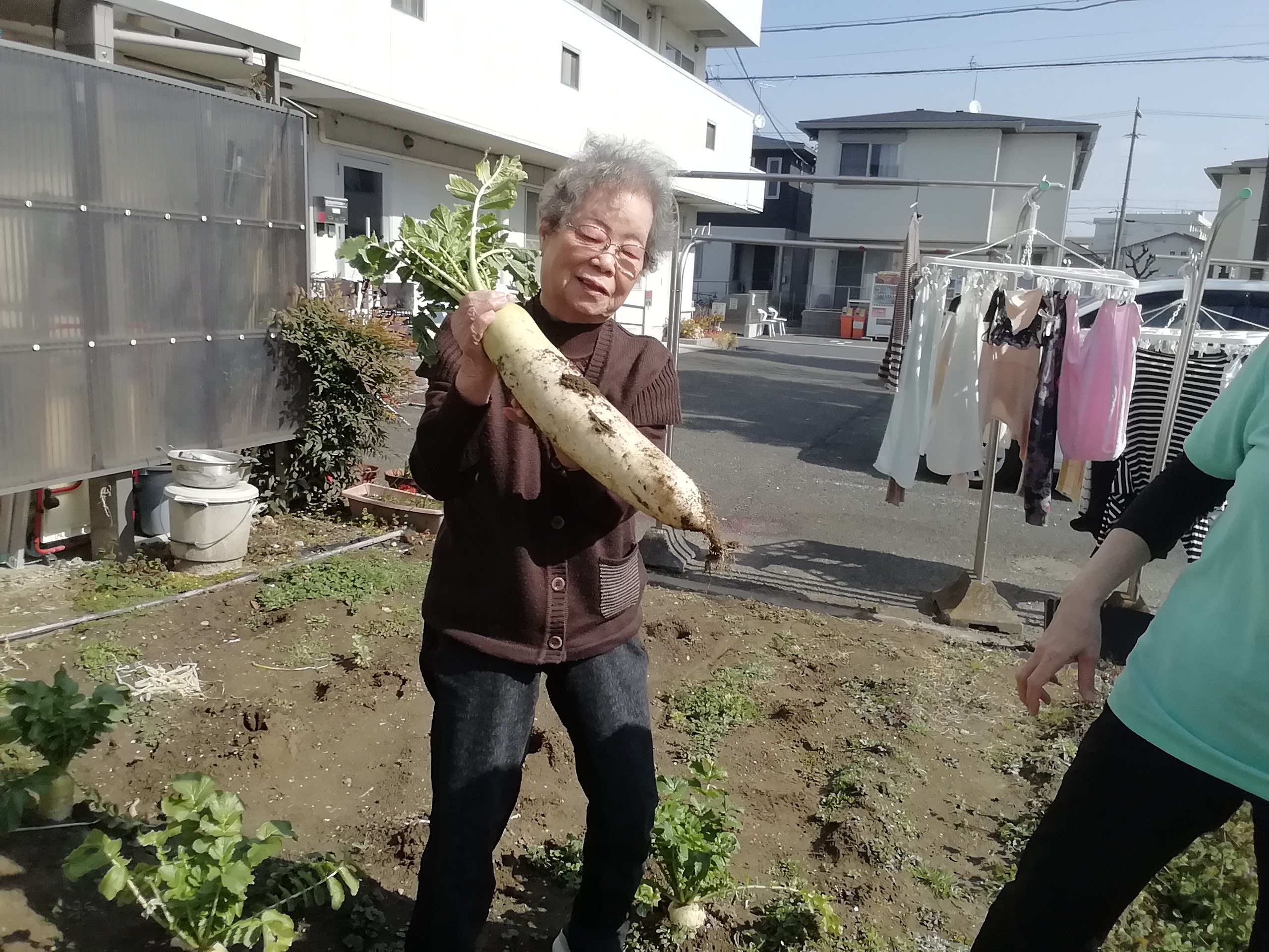 ゆうゆう畑で収穫した大根。先月はおでんを作り、今月は、豚汁を作りました。まずは、大根の収穫から見ていただきましょう。