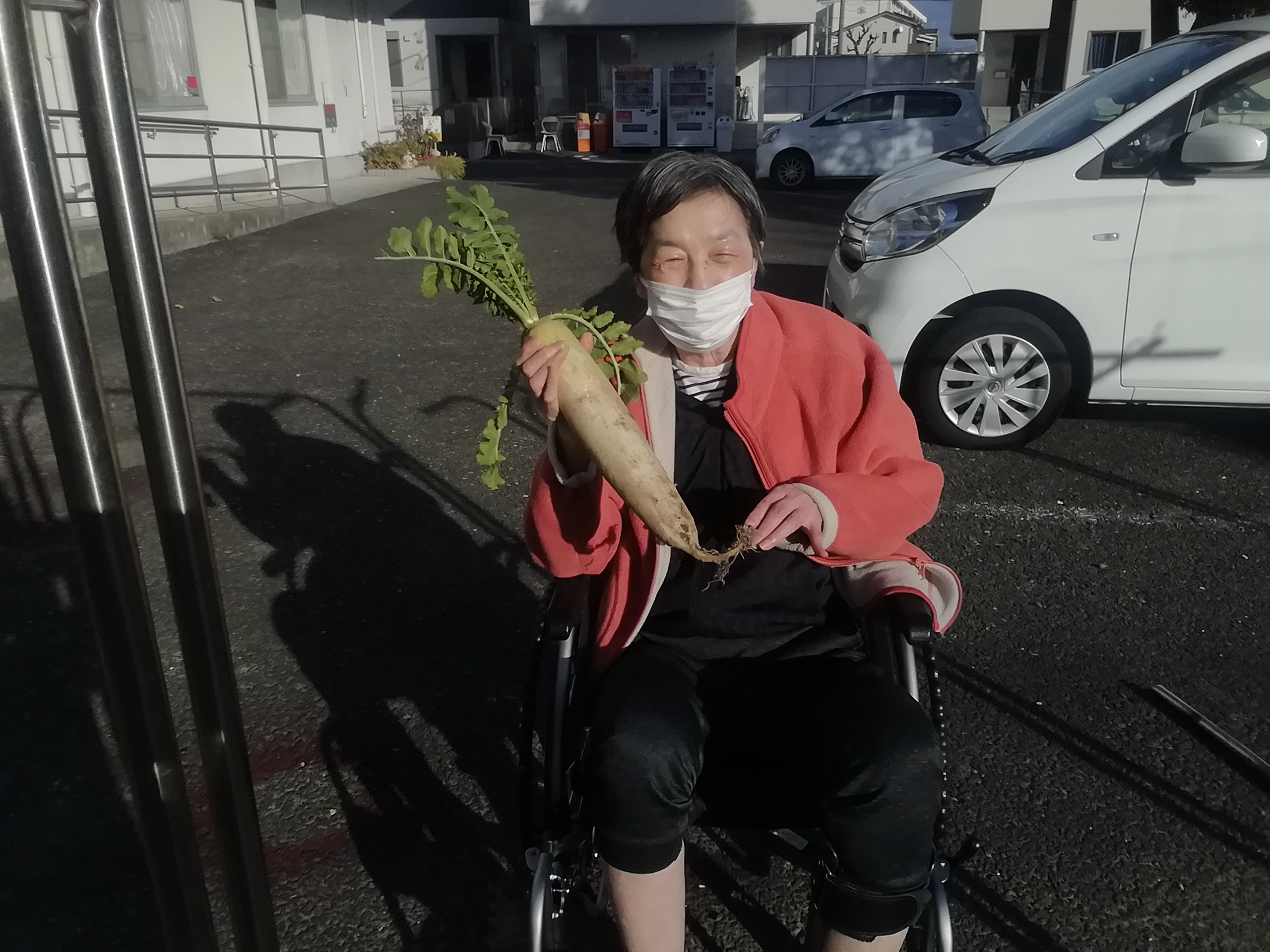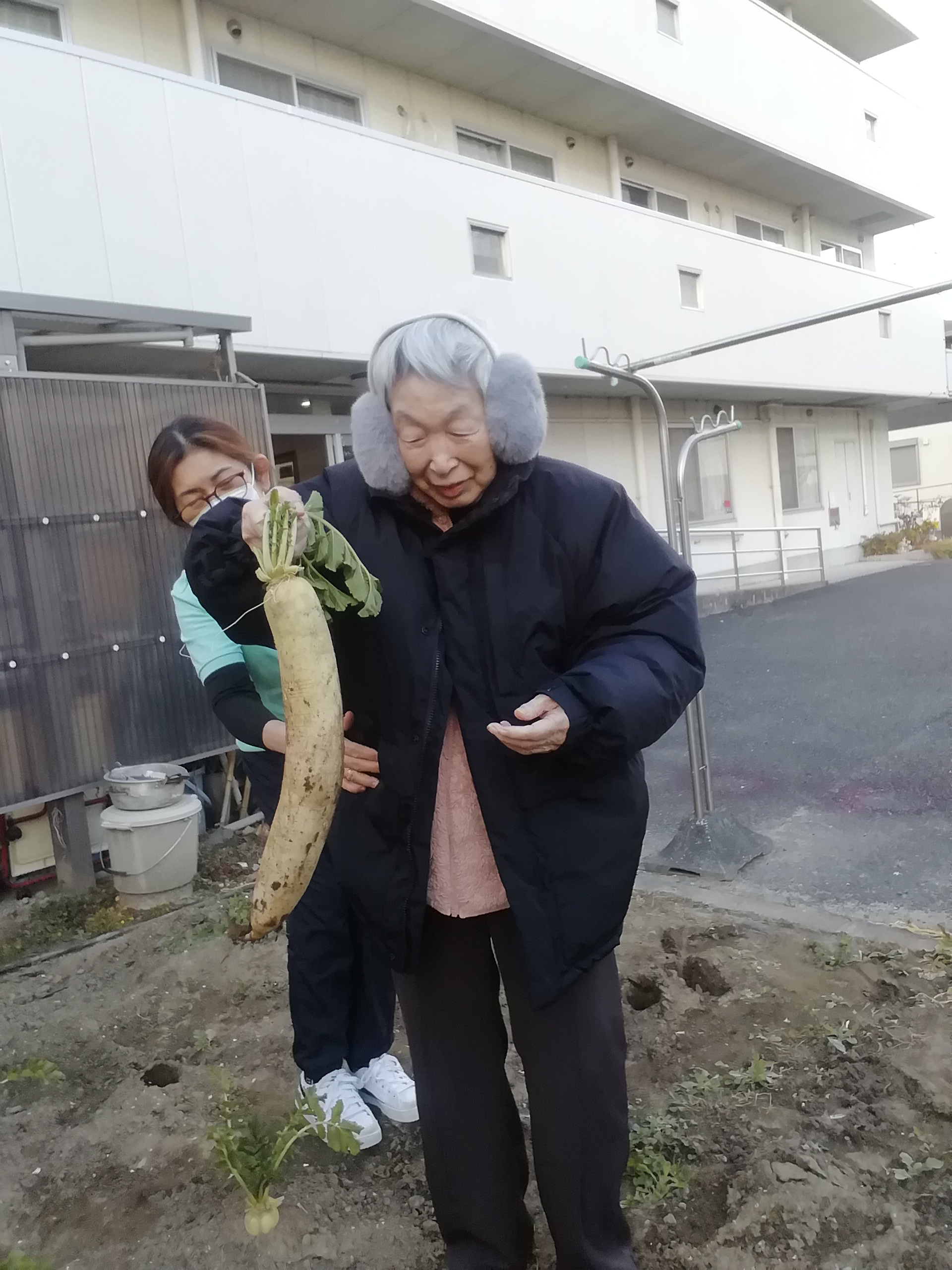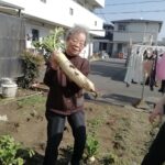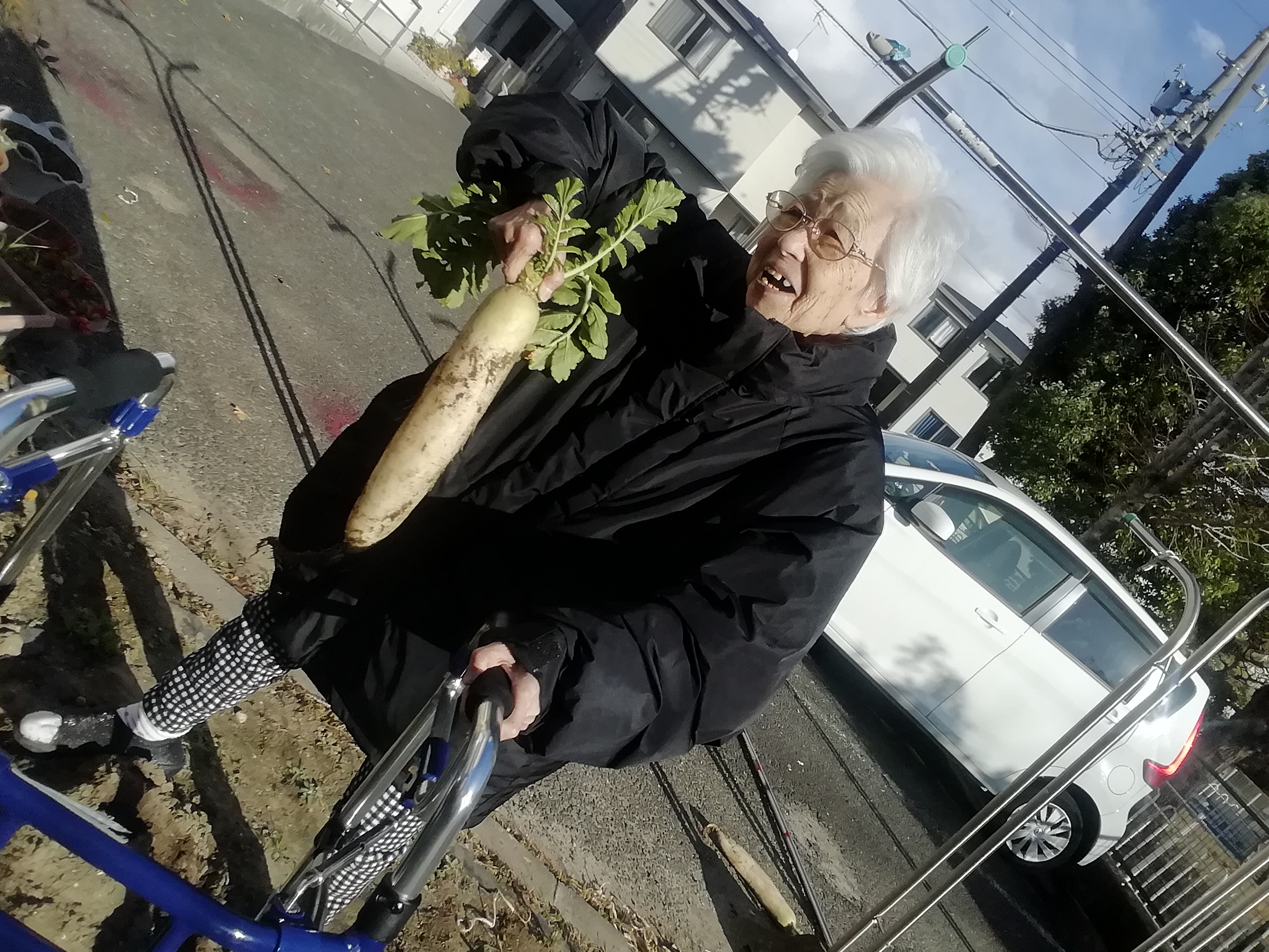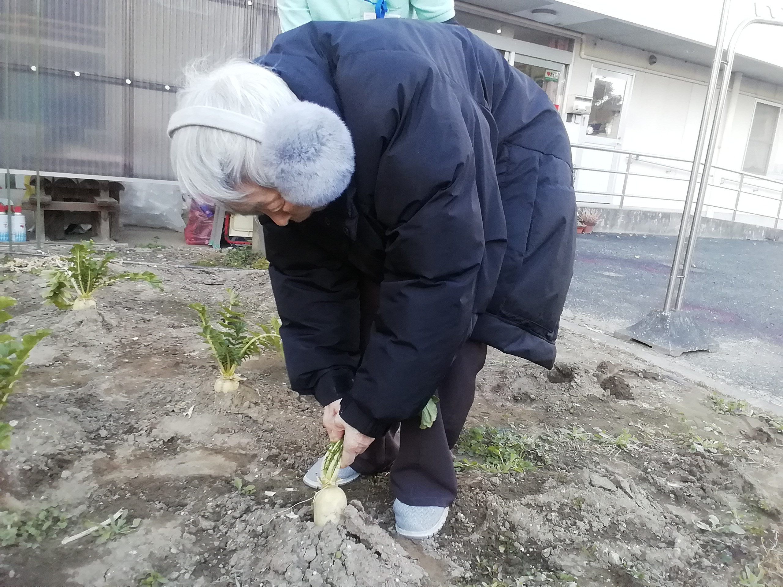 ゆうゆう畑で収穫した大根。先月はおでんを作り、今月は、豚汁を作りました。まずは、大根の収穫から見ていただきましょう。