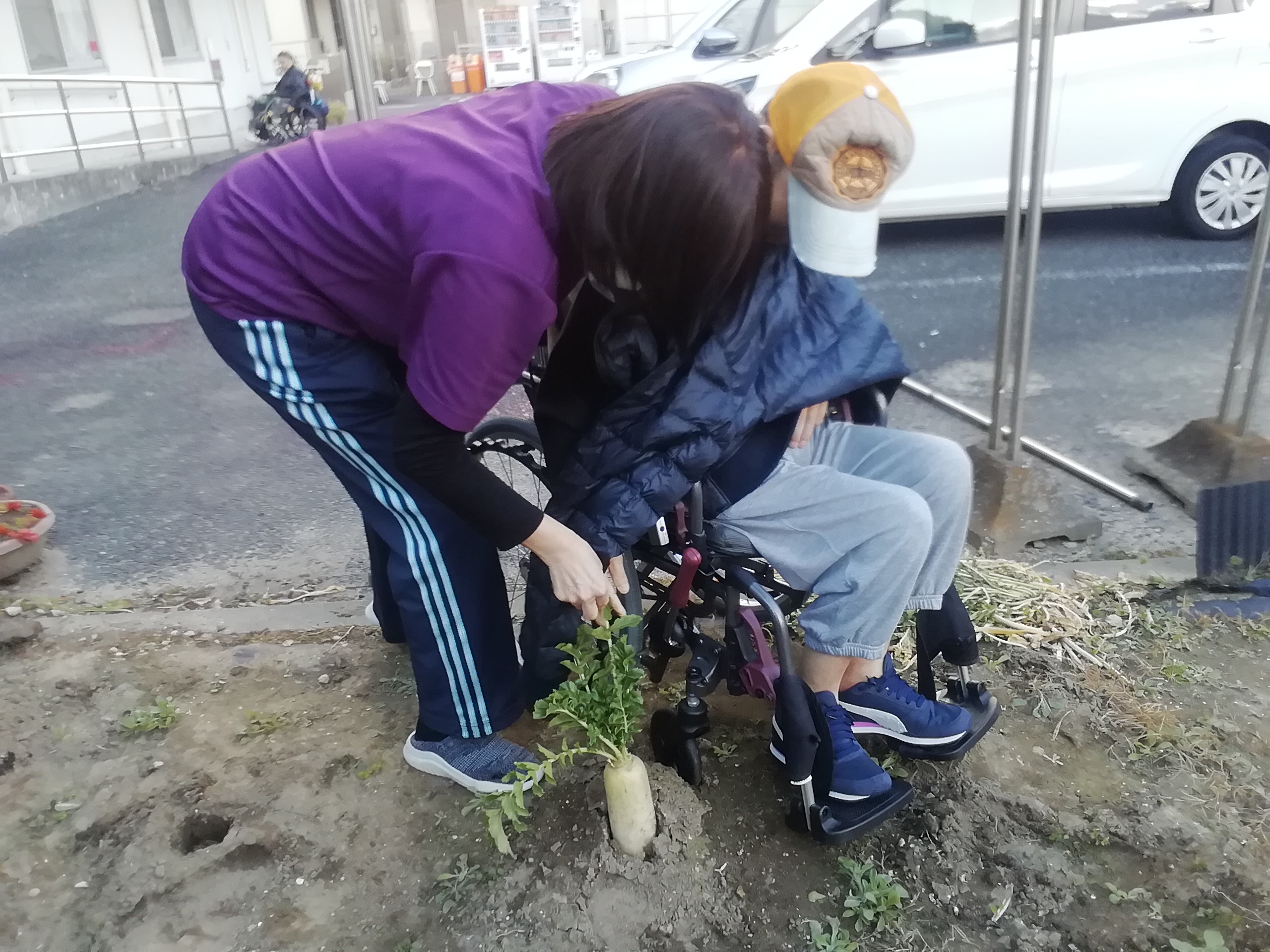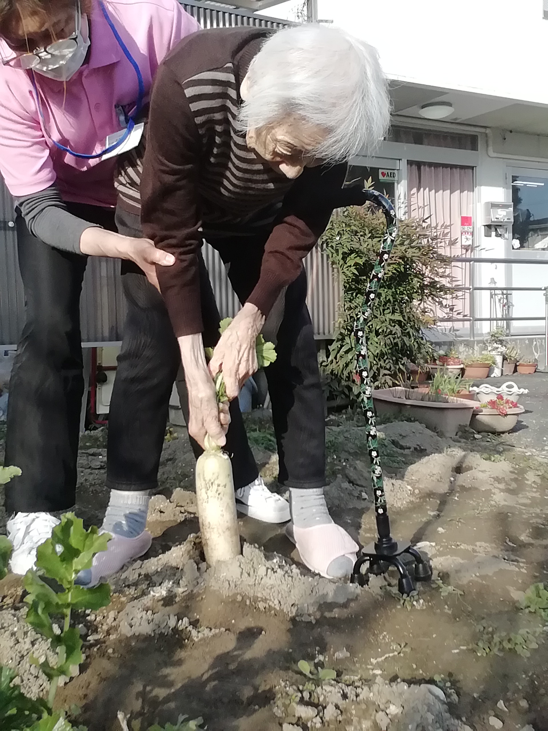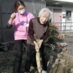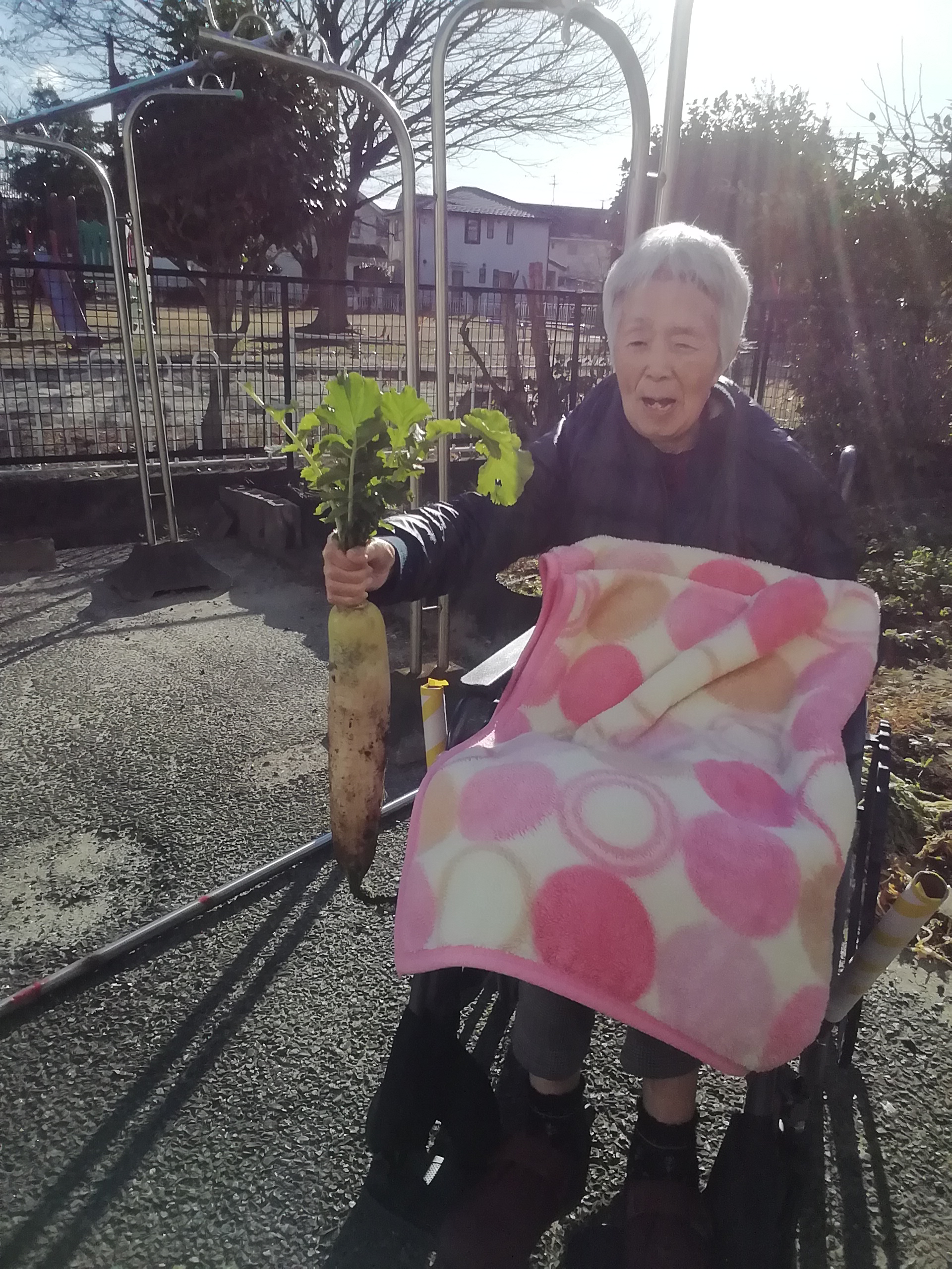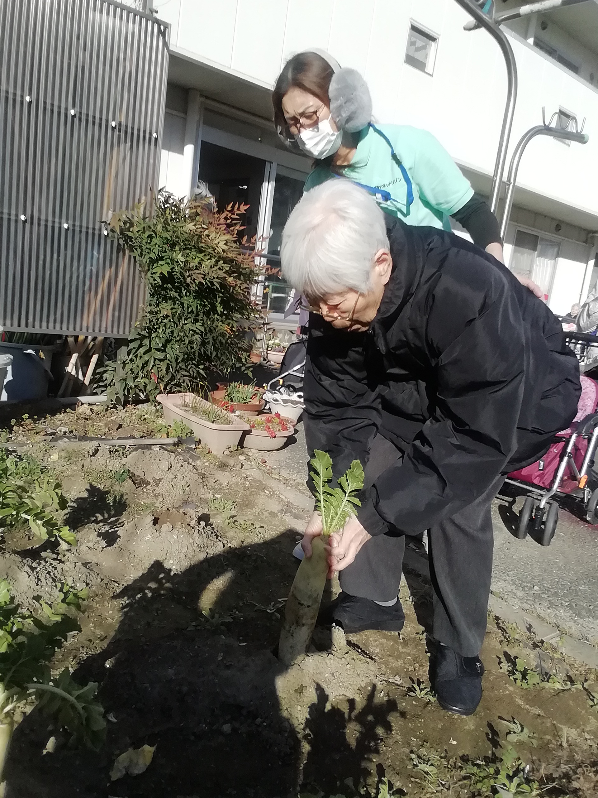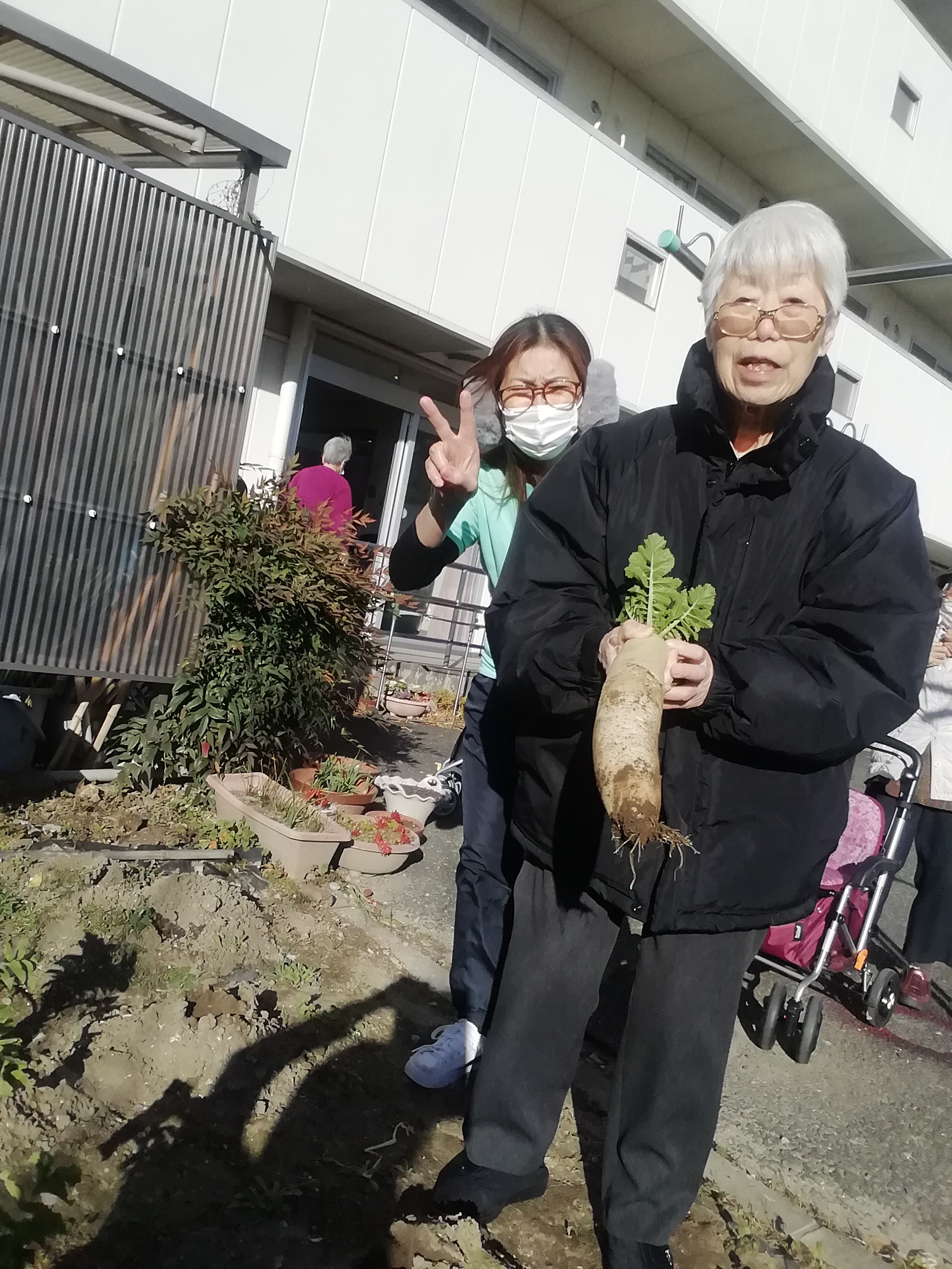ゆうゆう畑で収穫した大根。先月はおでんを作り、今月は、豚汁を作りました。まずは、大根の収穫から見ていただきましょう。