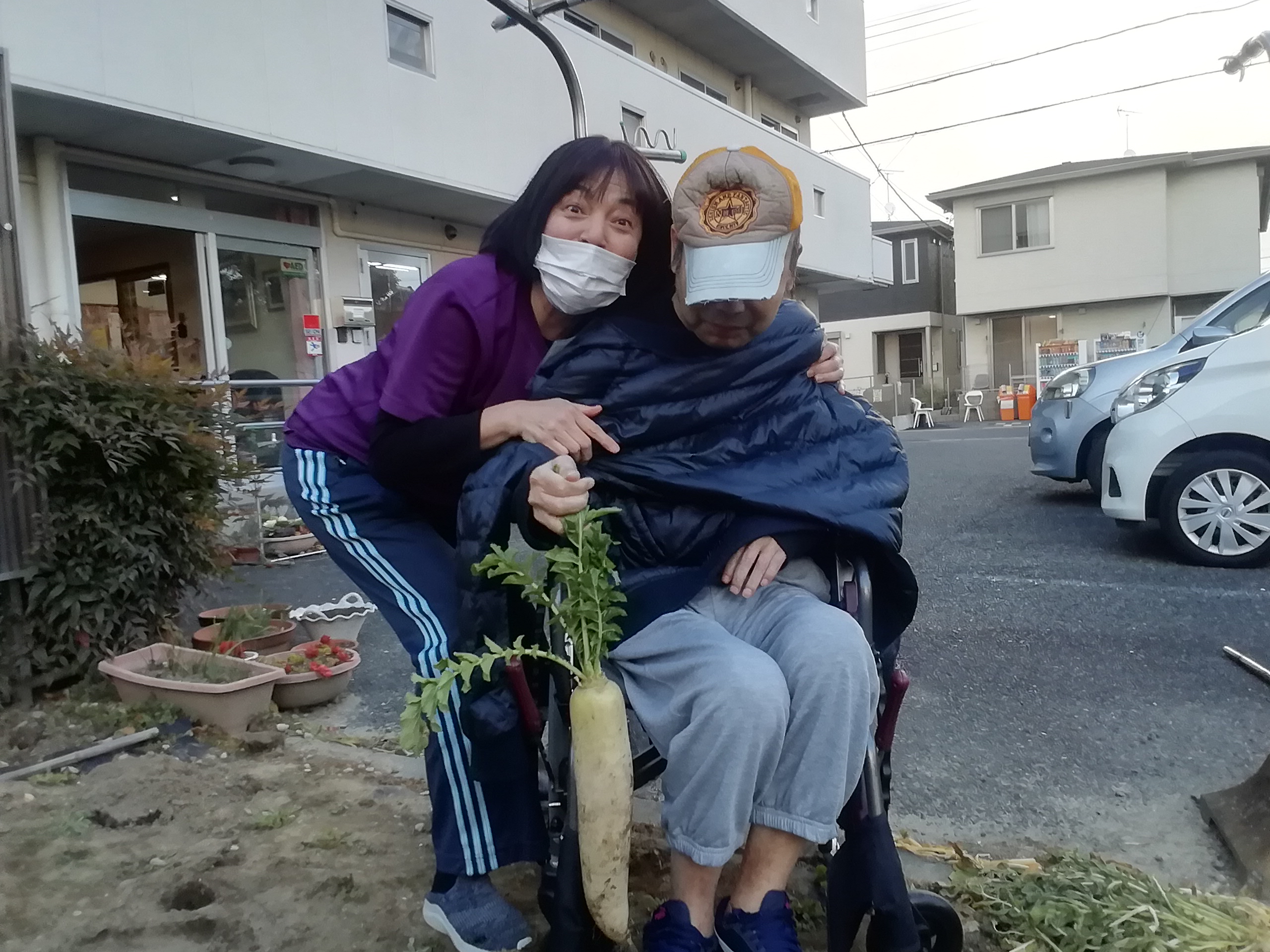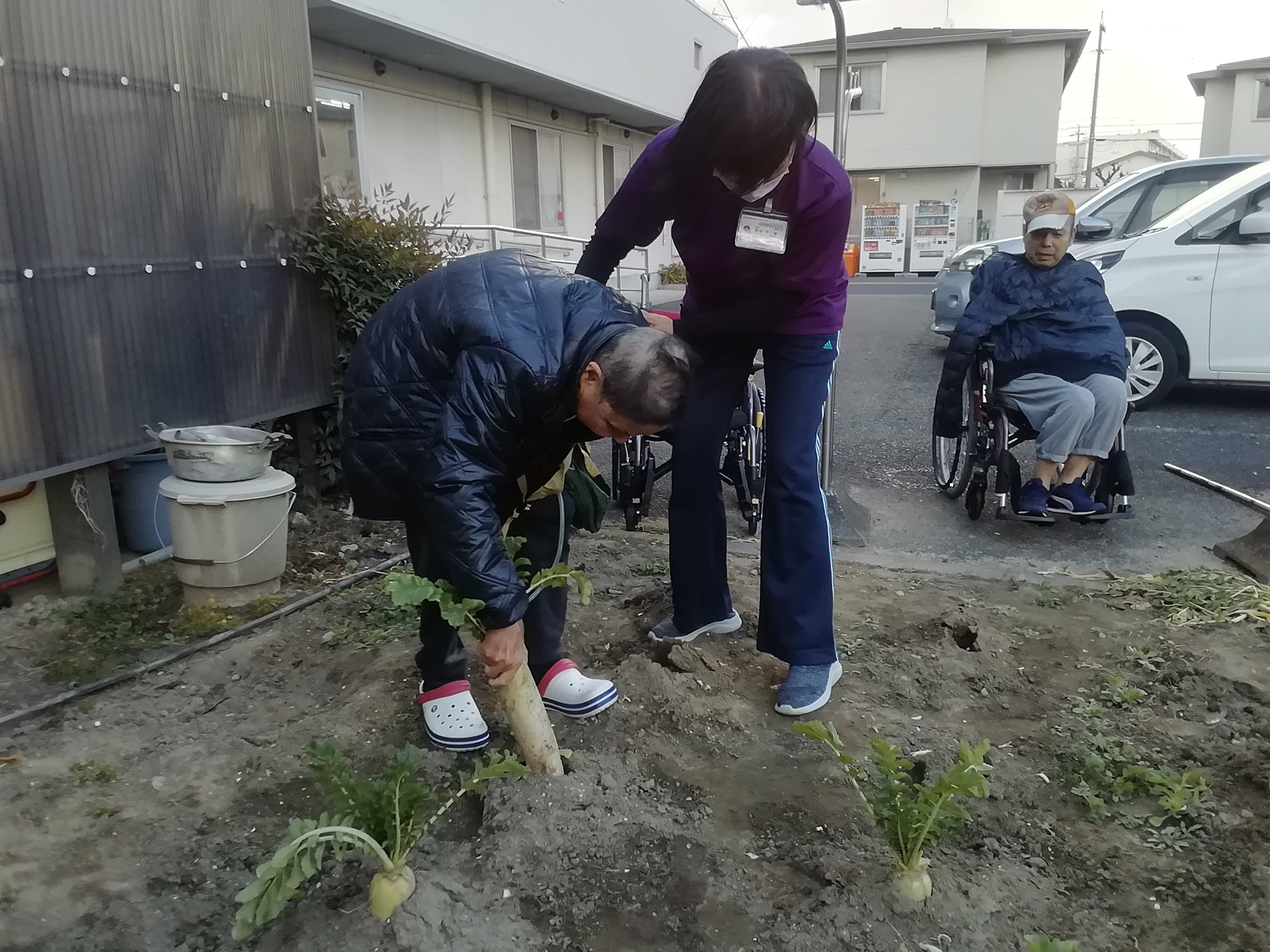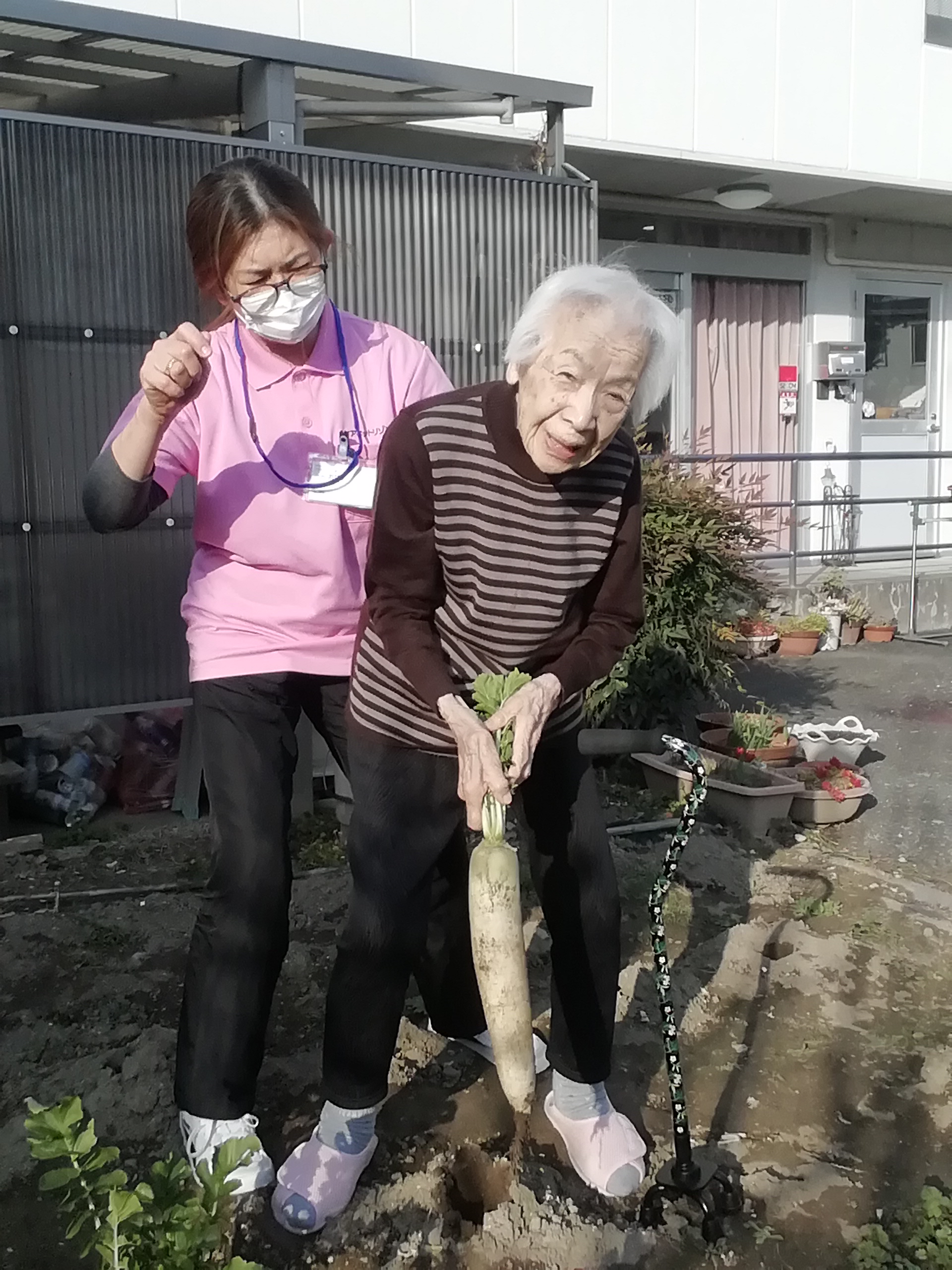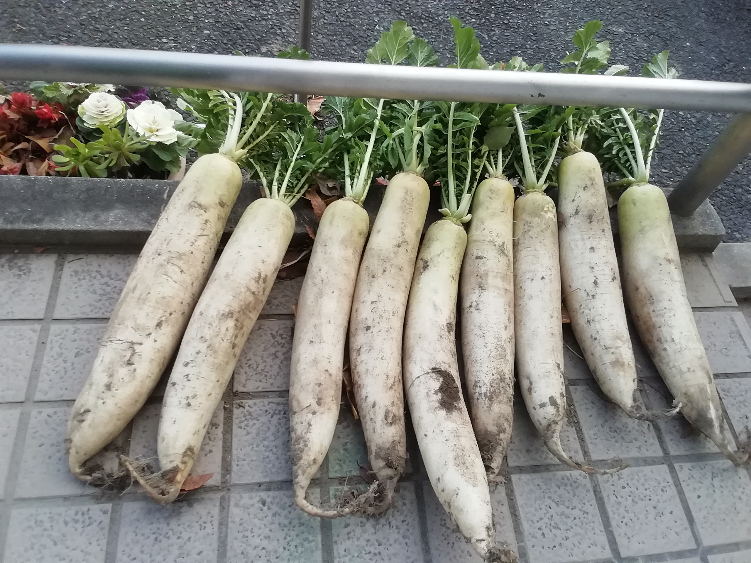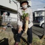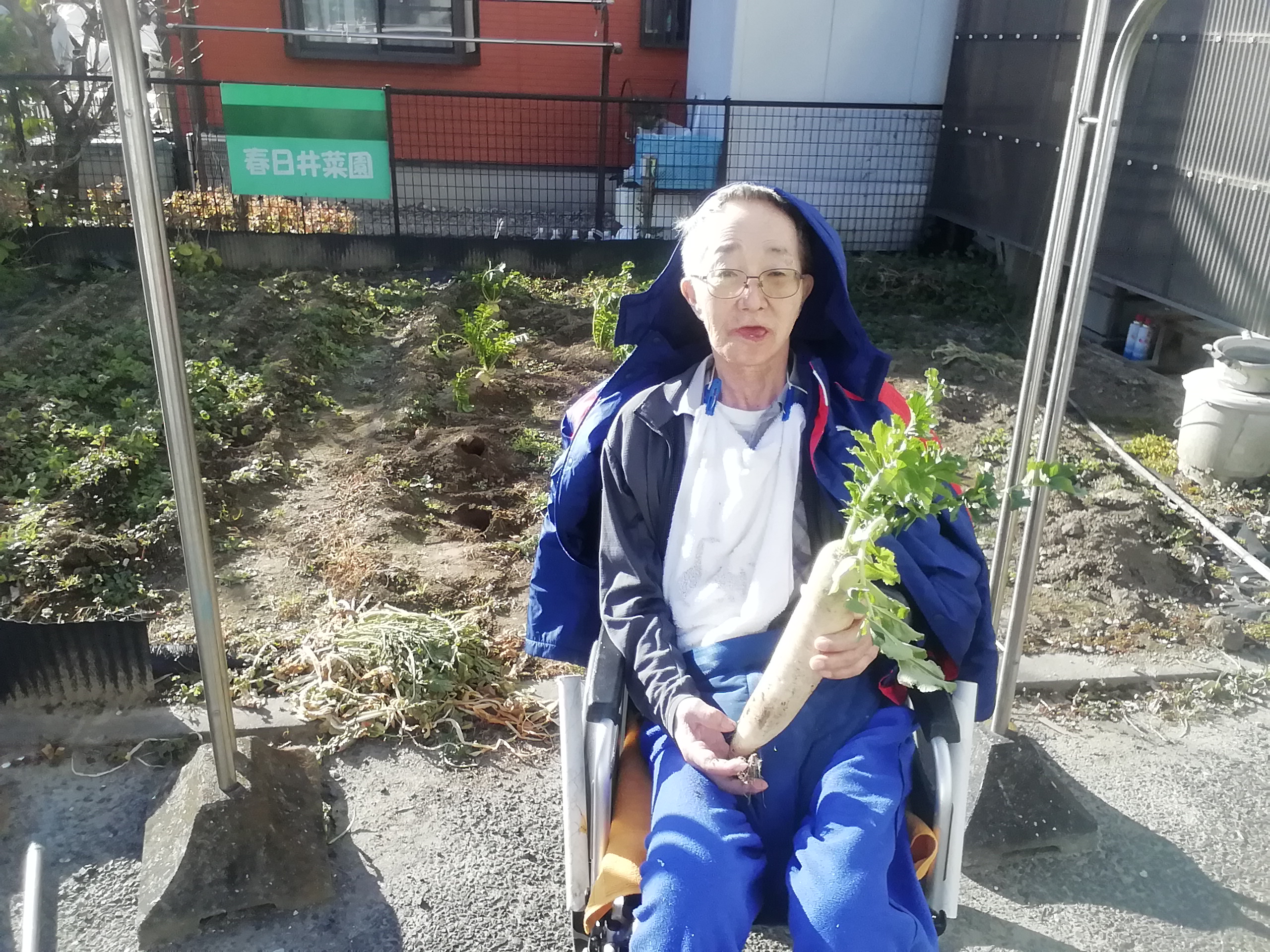ゆうゆう畑で収穫した大根。先月はおでんを作り、今月は、豚汁を作りました。まずは、大根の収穫から見ていただきましょう。