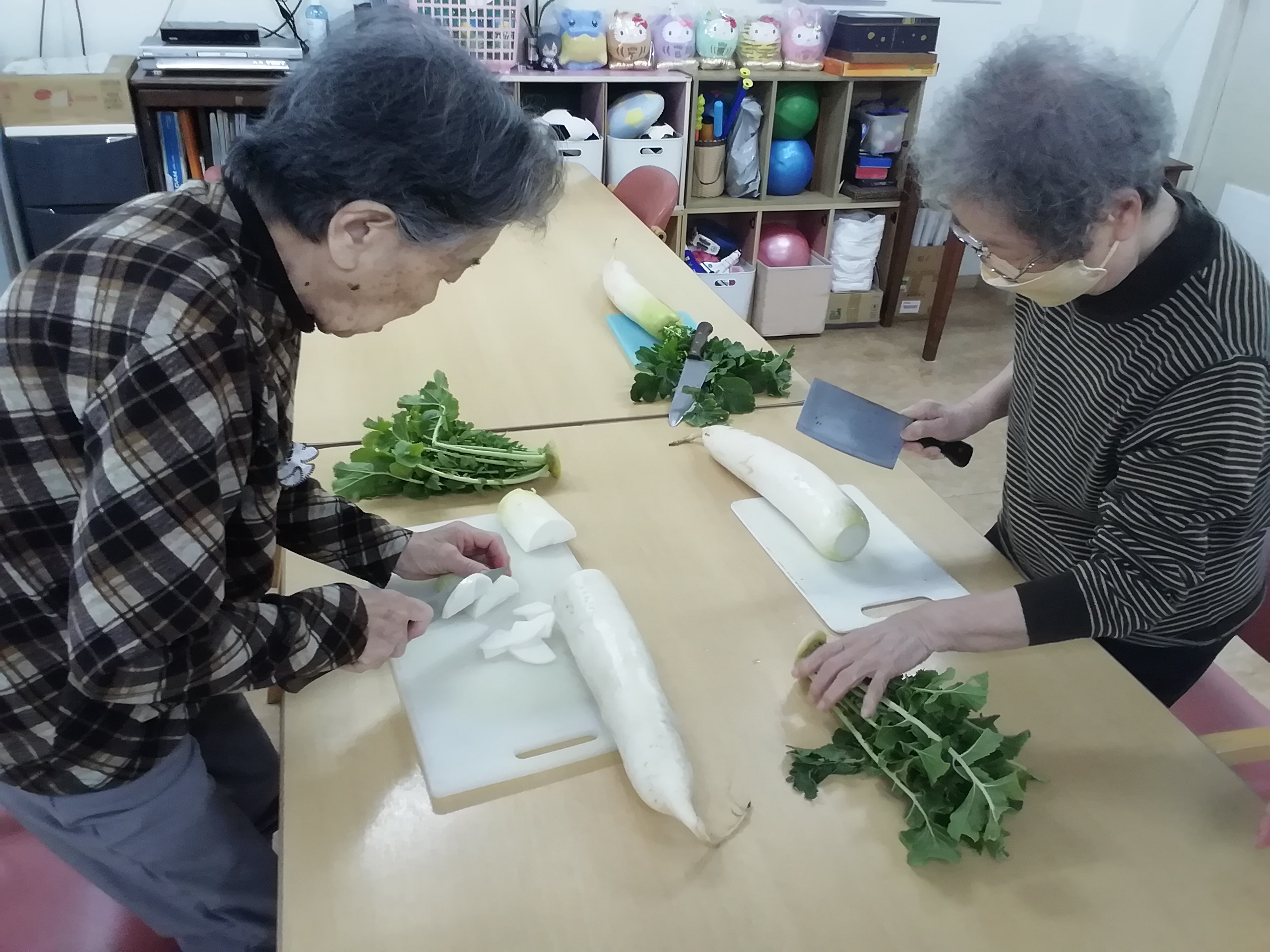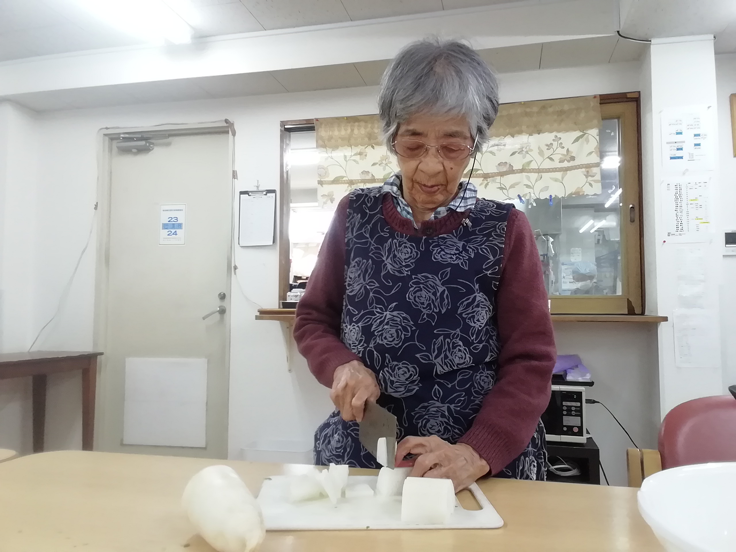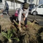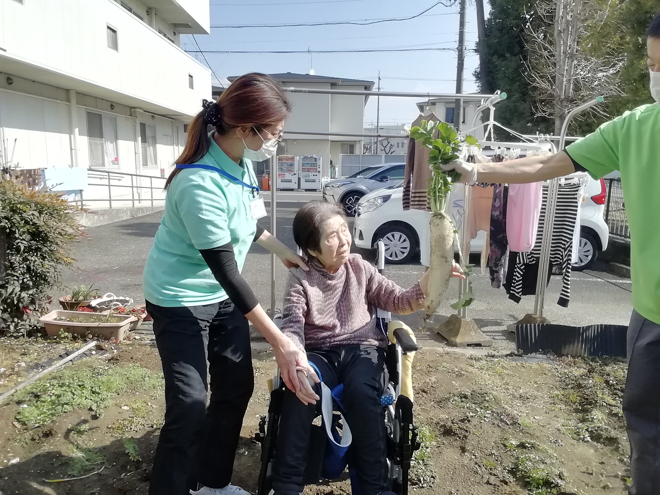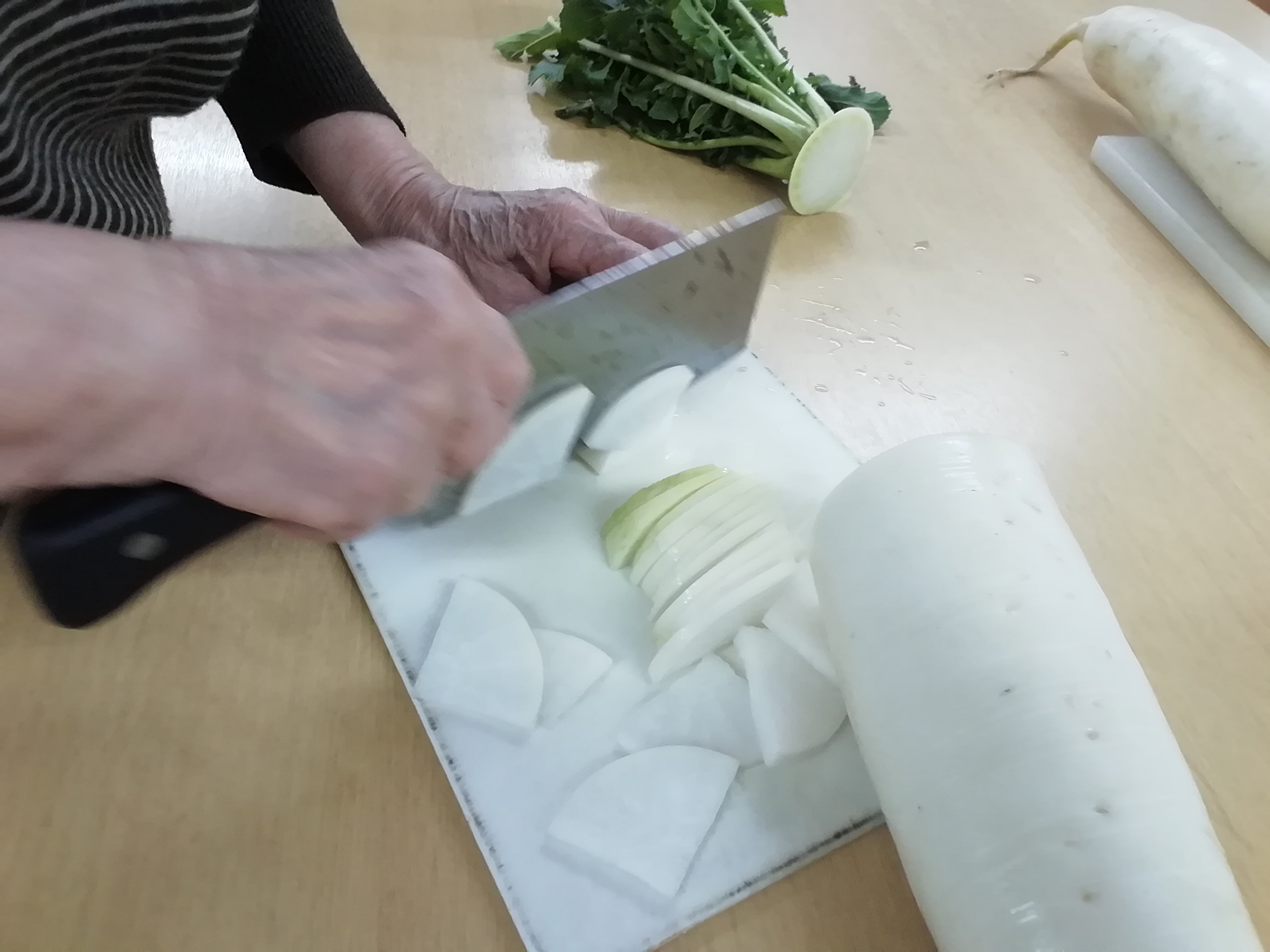 ゆうゆう畑で収穫した大根。先月はおでんを作り、今月は、豚汁を作りました。まずは、大根の収穫から見ていただきましょう。