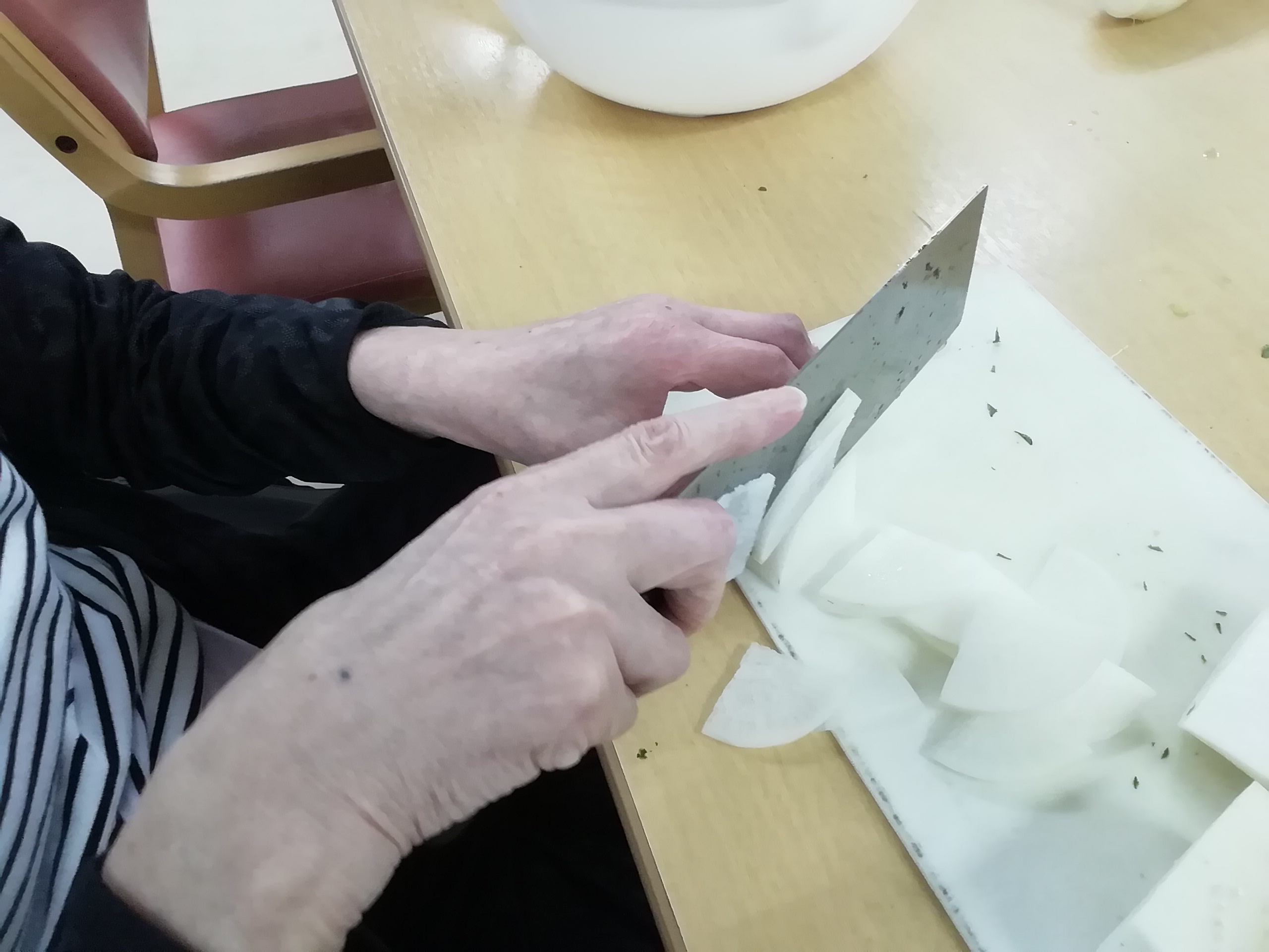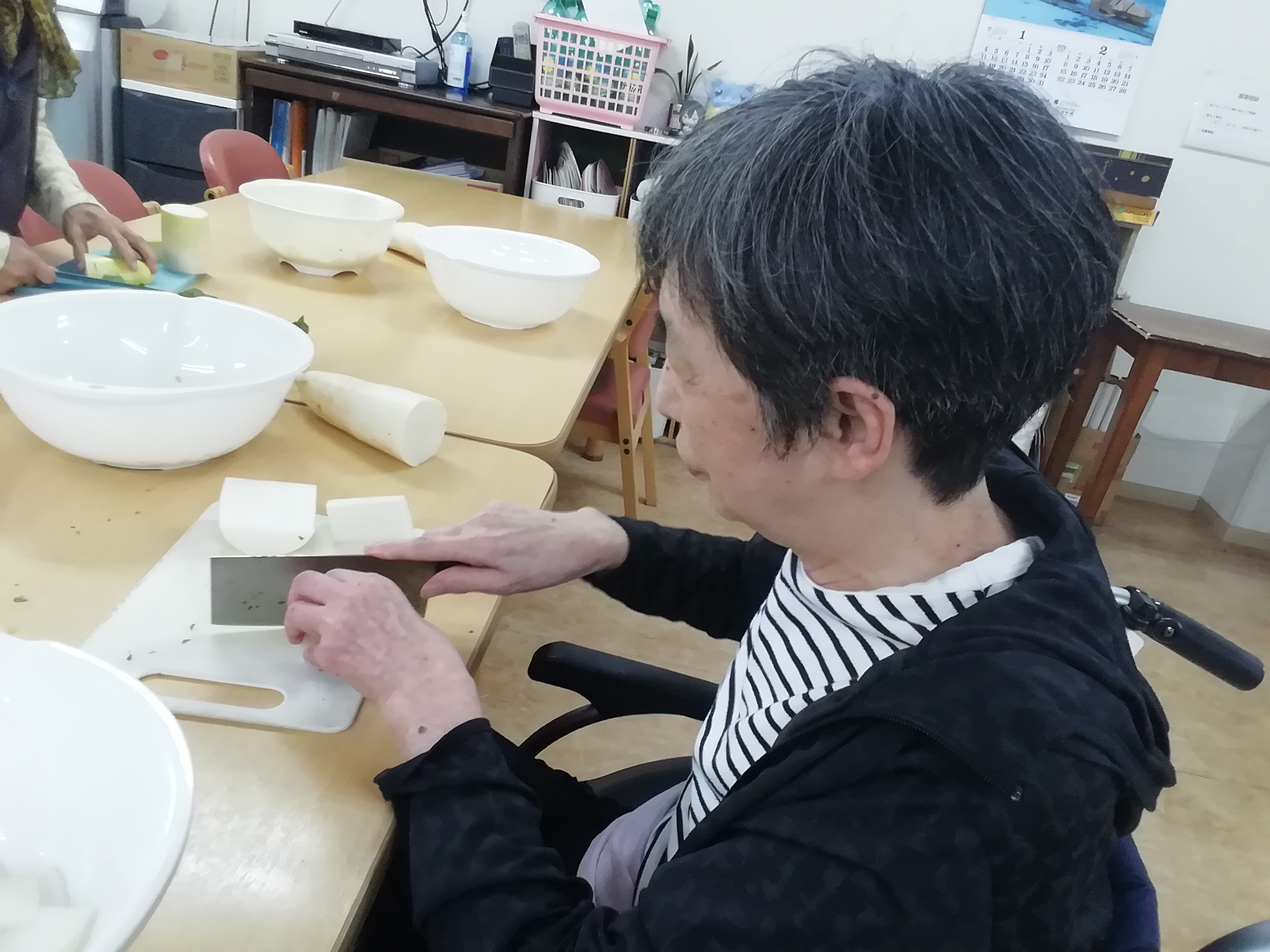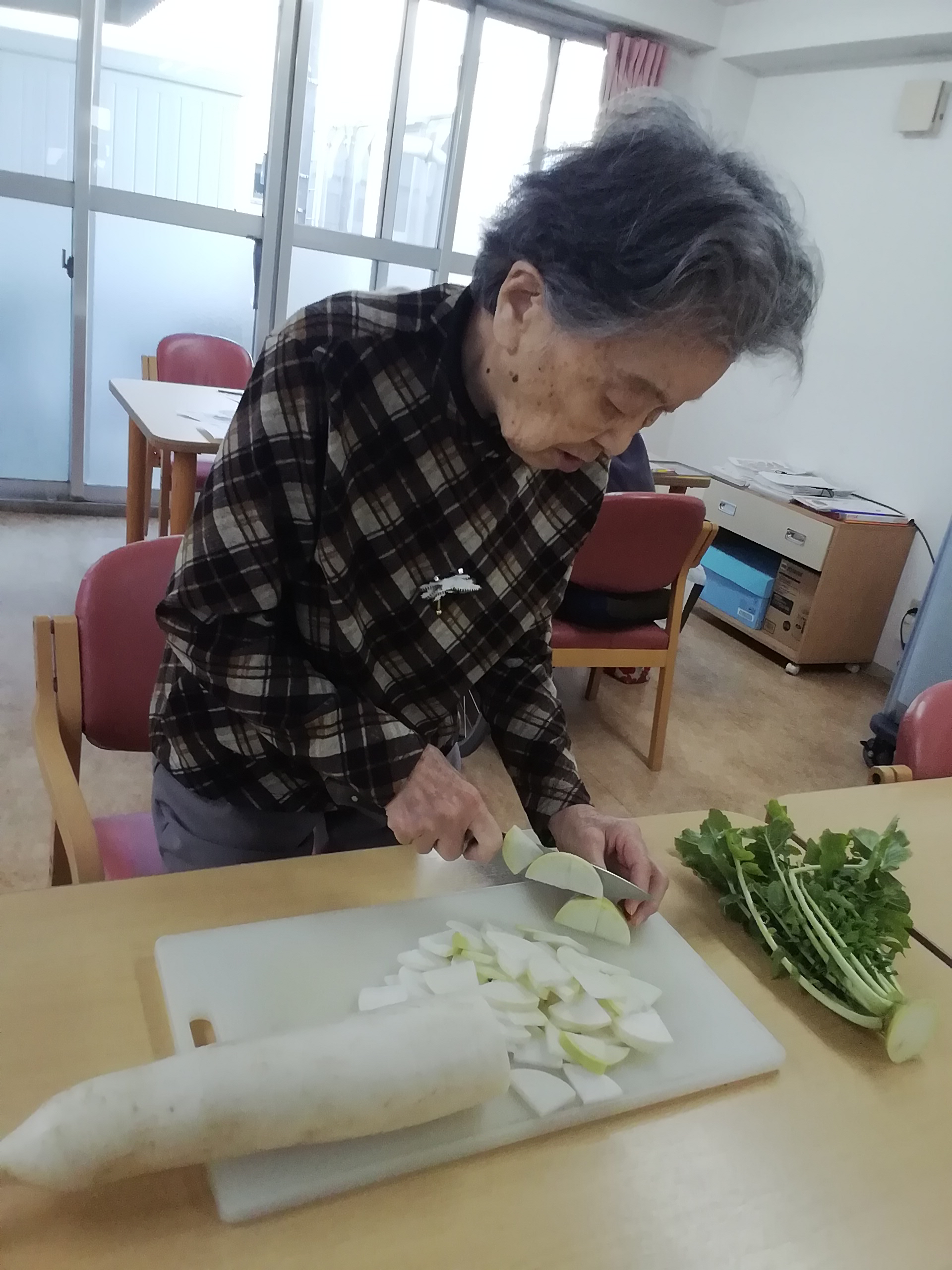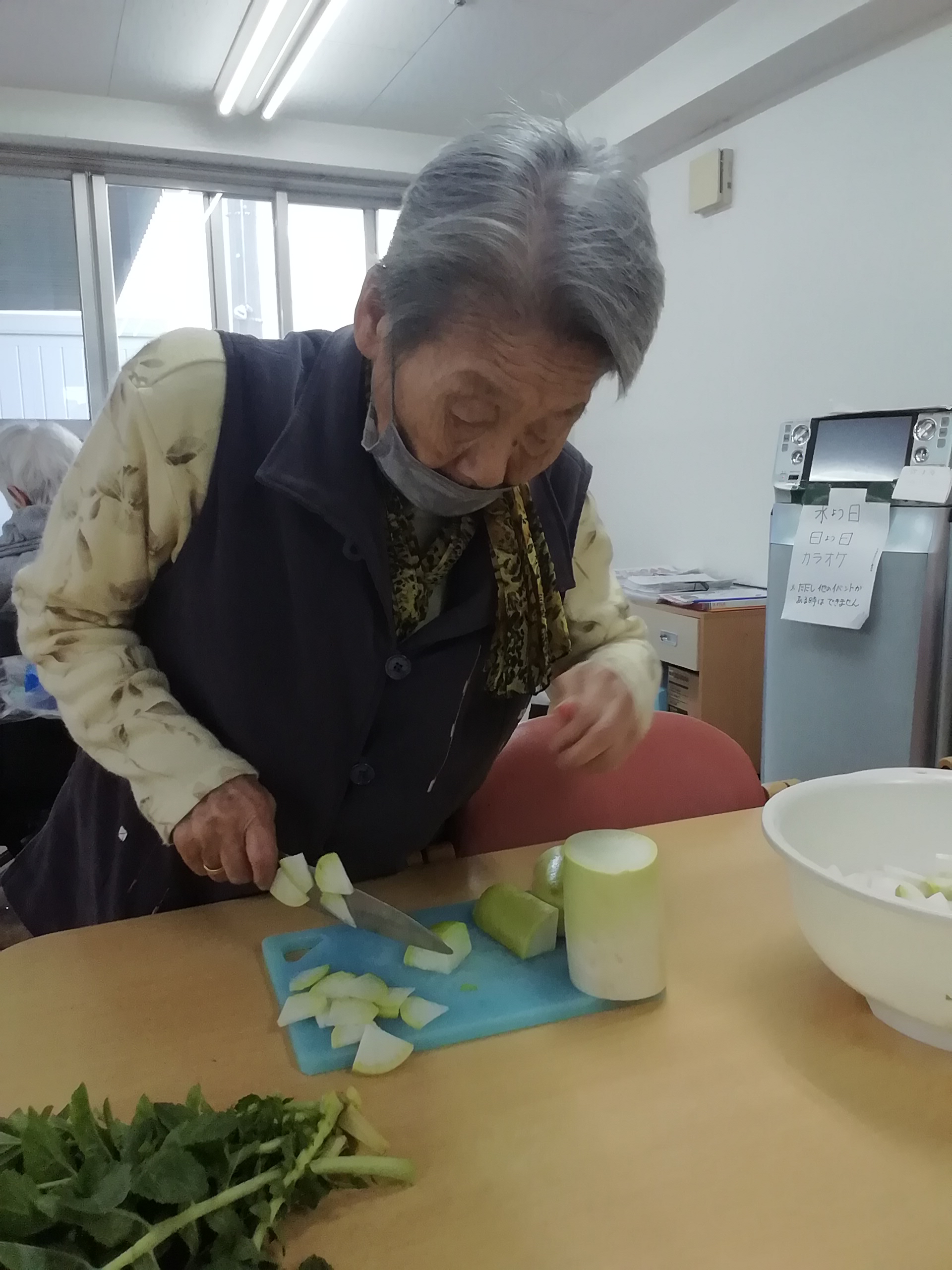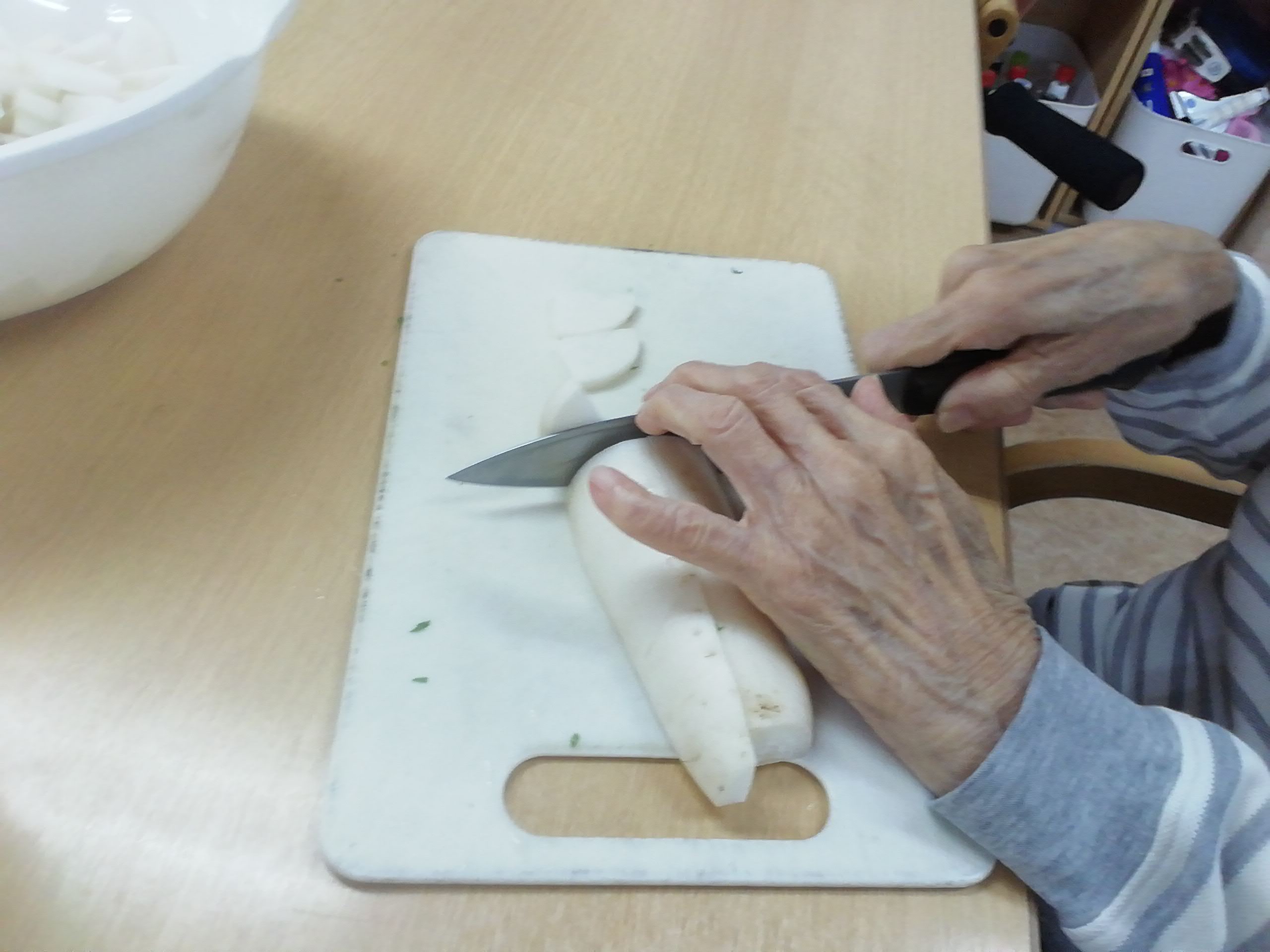 ゆうゆう畑で収穫した大根。先月はおでんを作り、今月は、豚汁を作りました。まずは、大根の収穫から見ていただきましょう。
