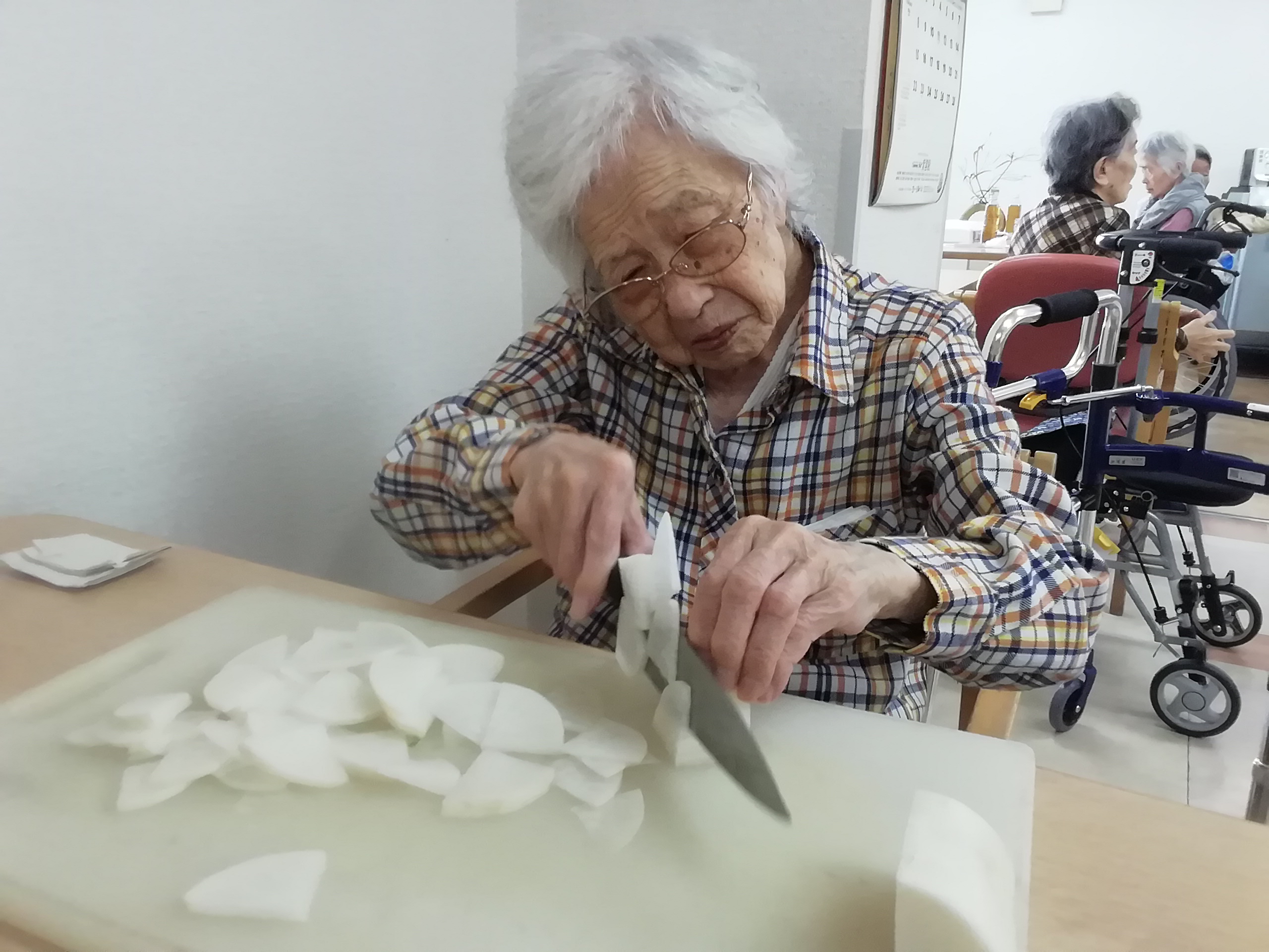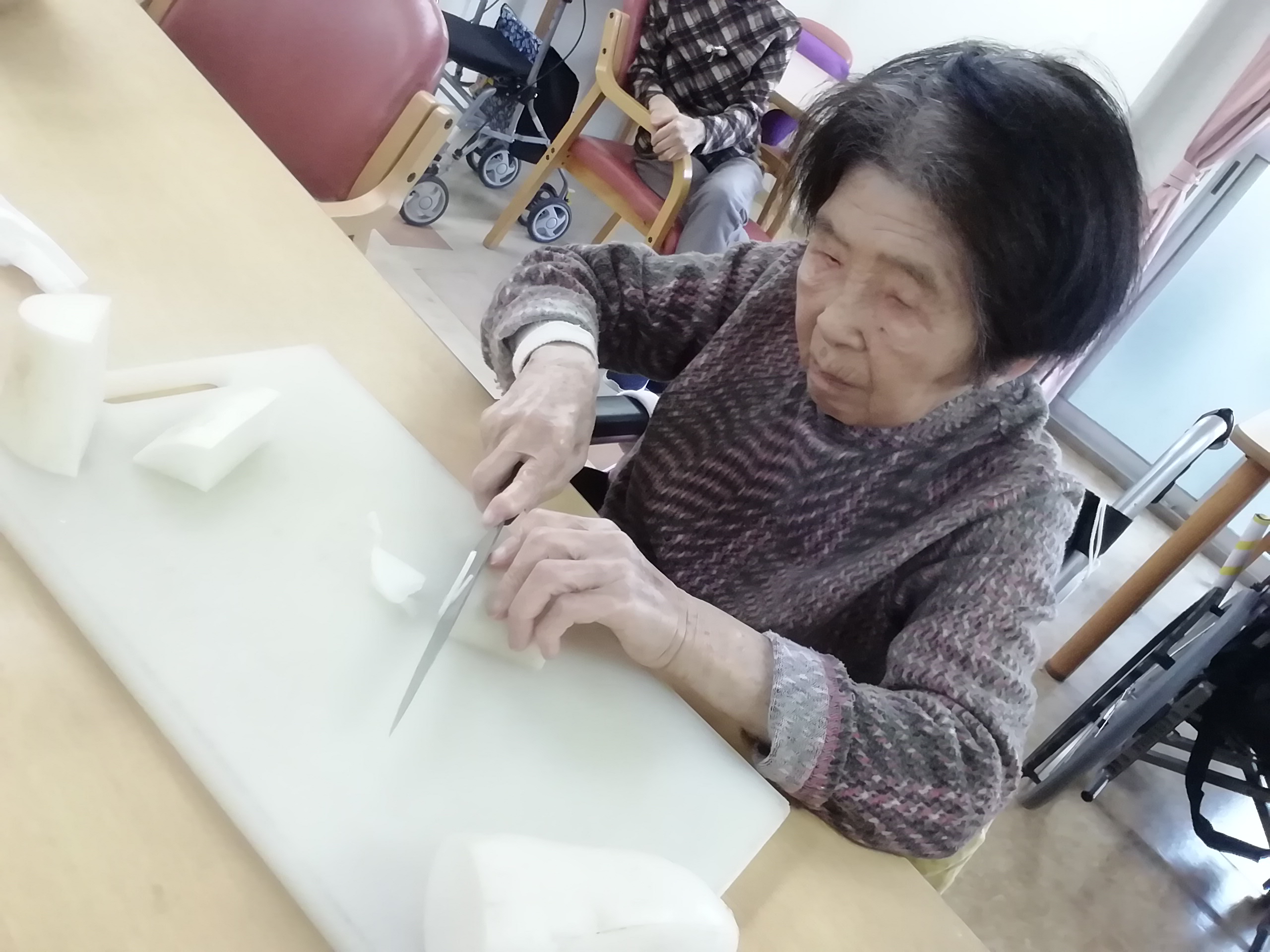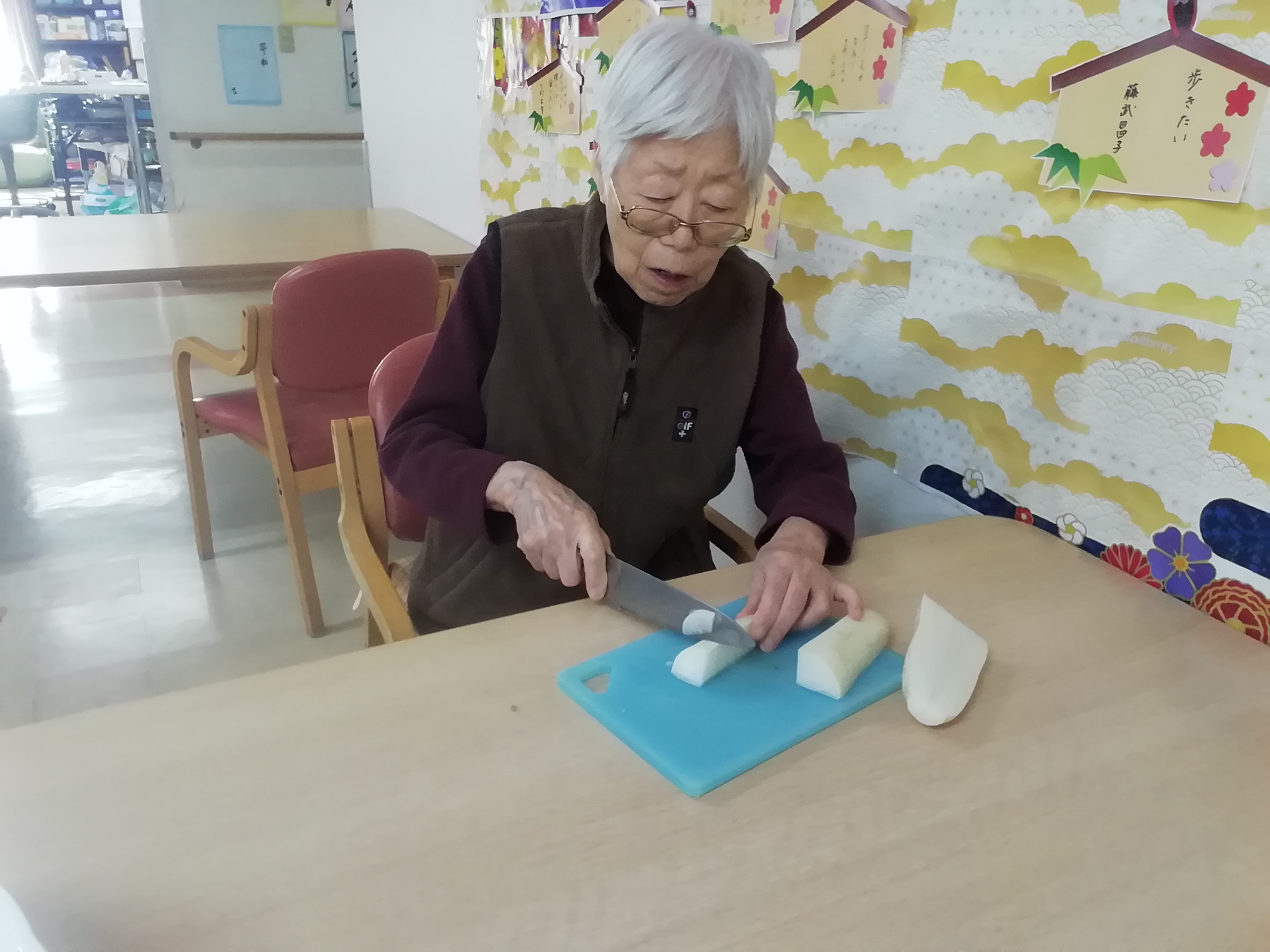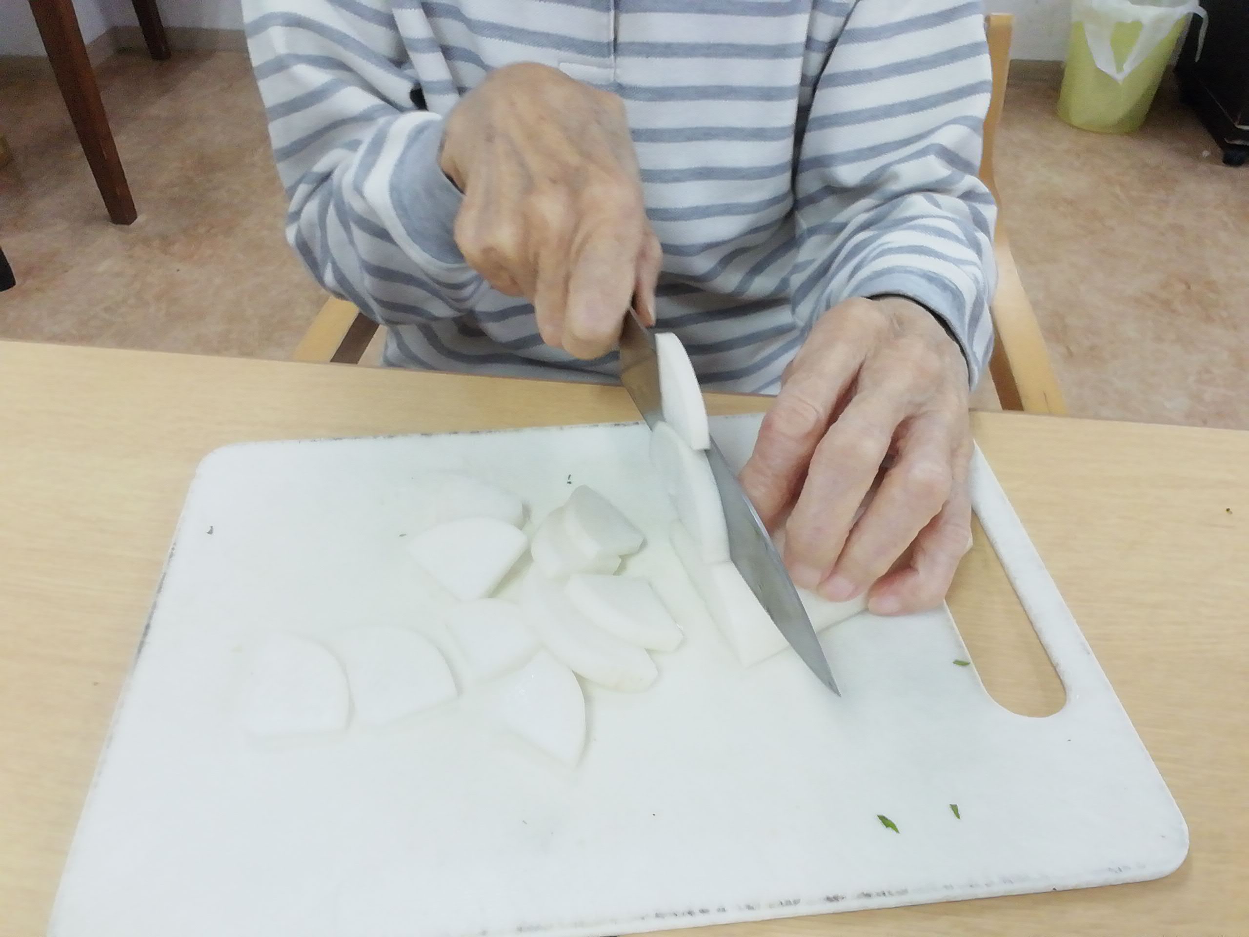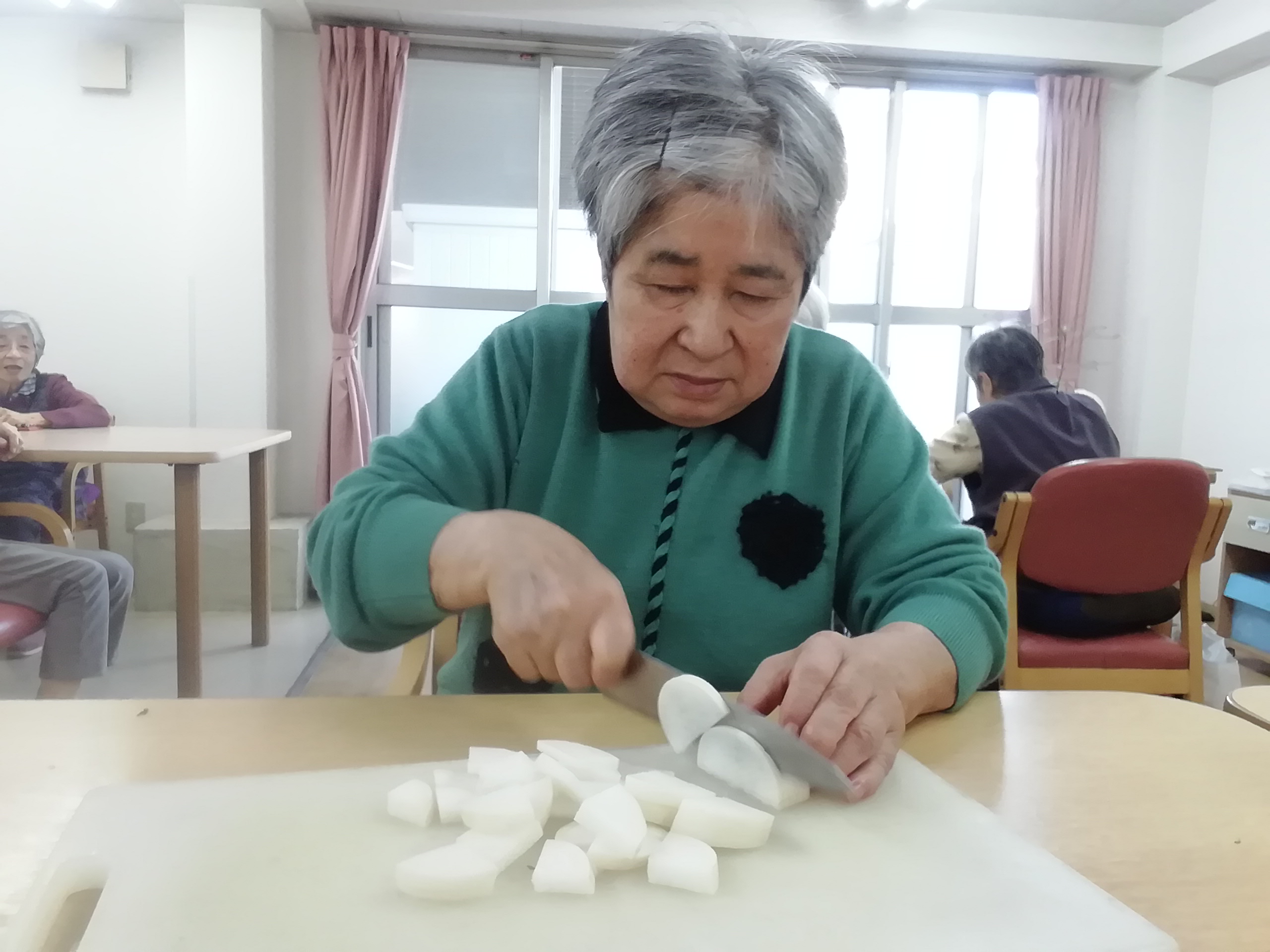 ゆうゆう畑で収穫した大根。先月はおでんを作り、今月は、豚汁を作りました。まずは、大根の収穫から見ていただきましょう。