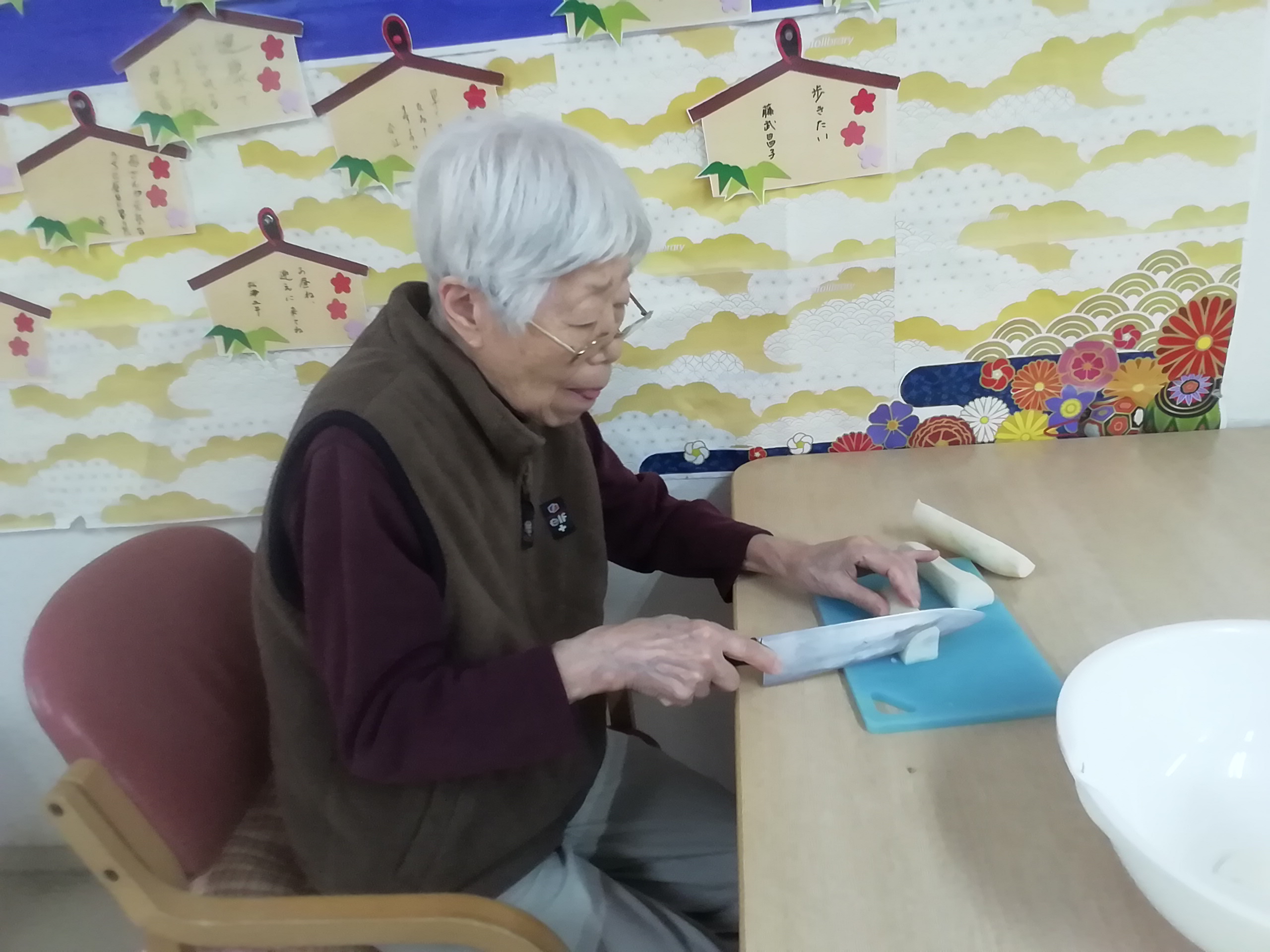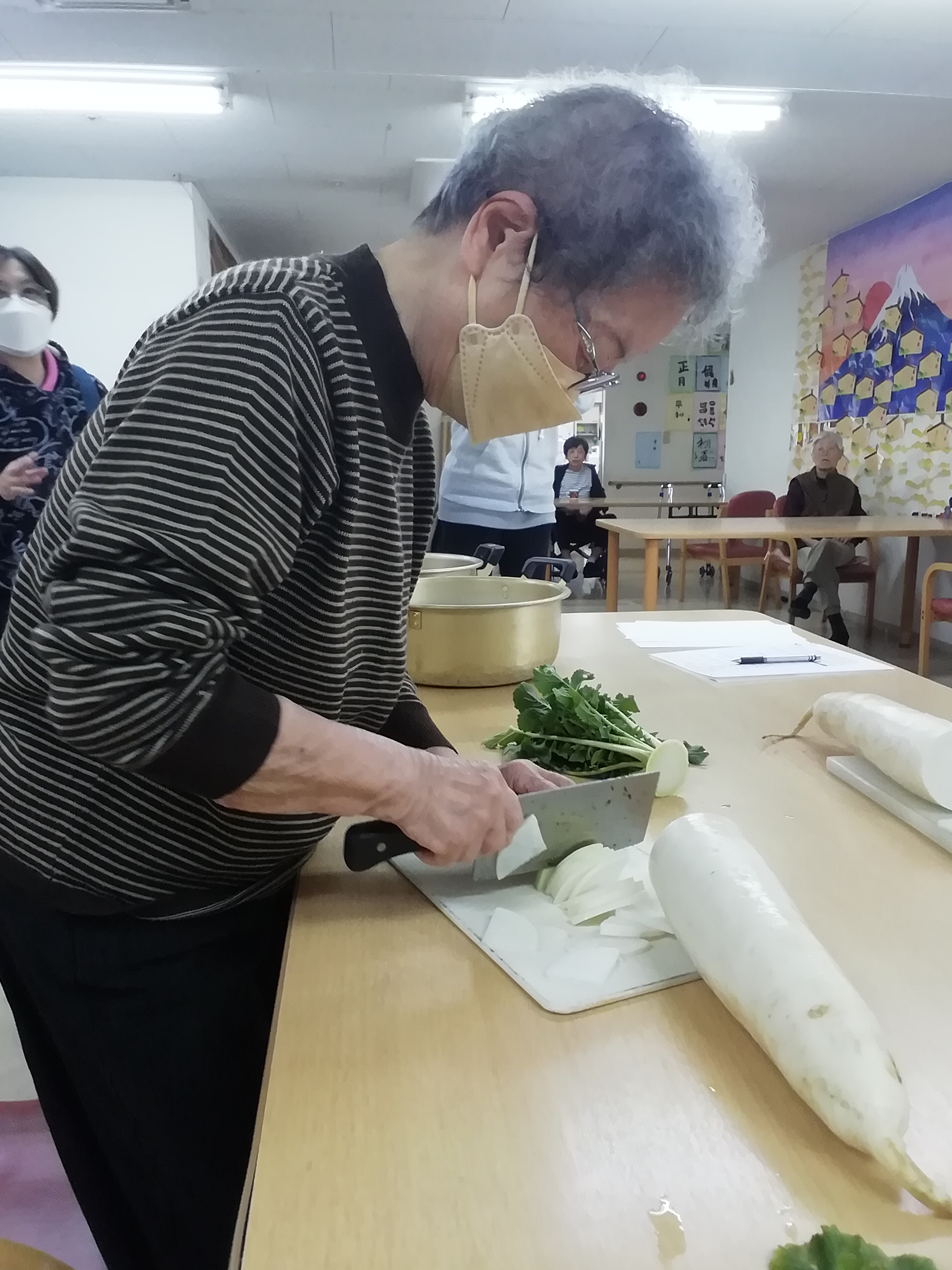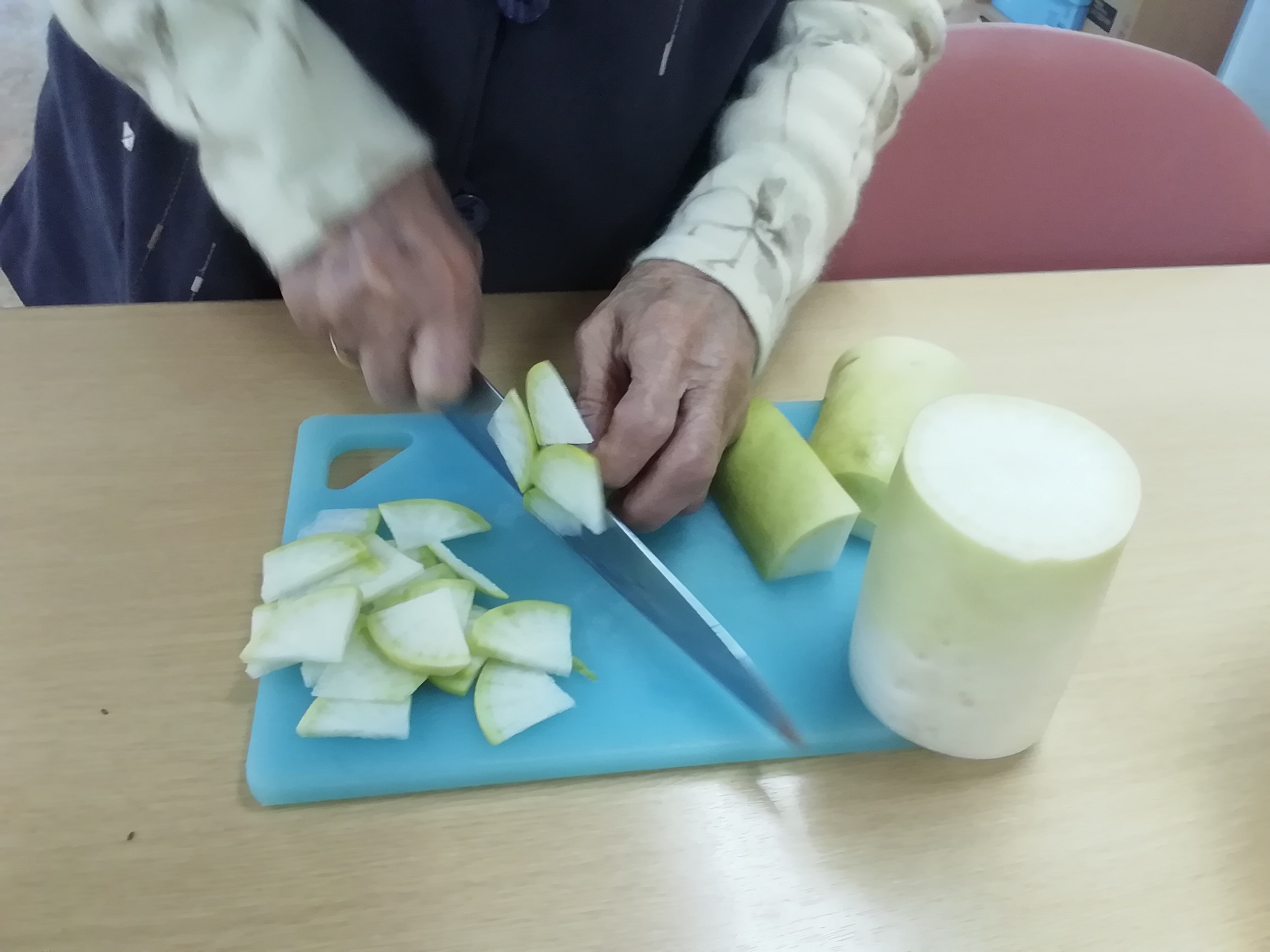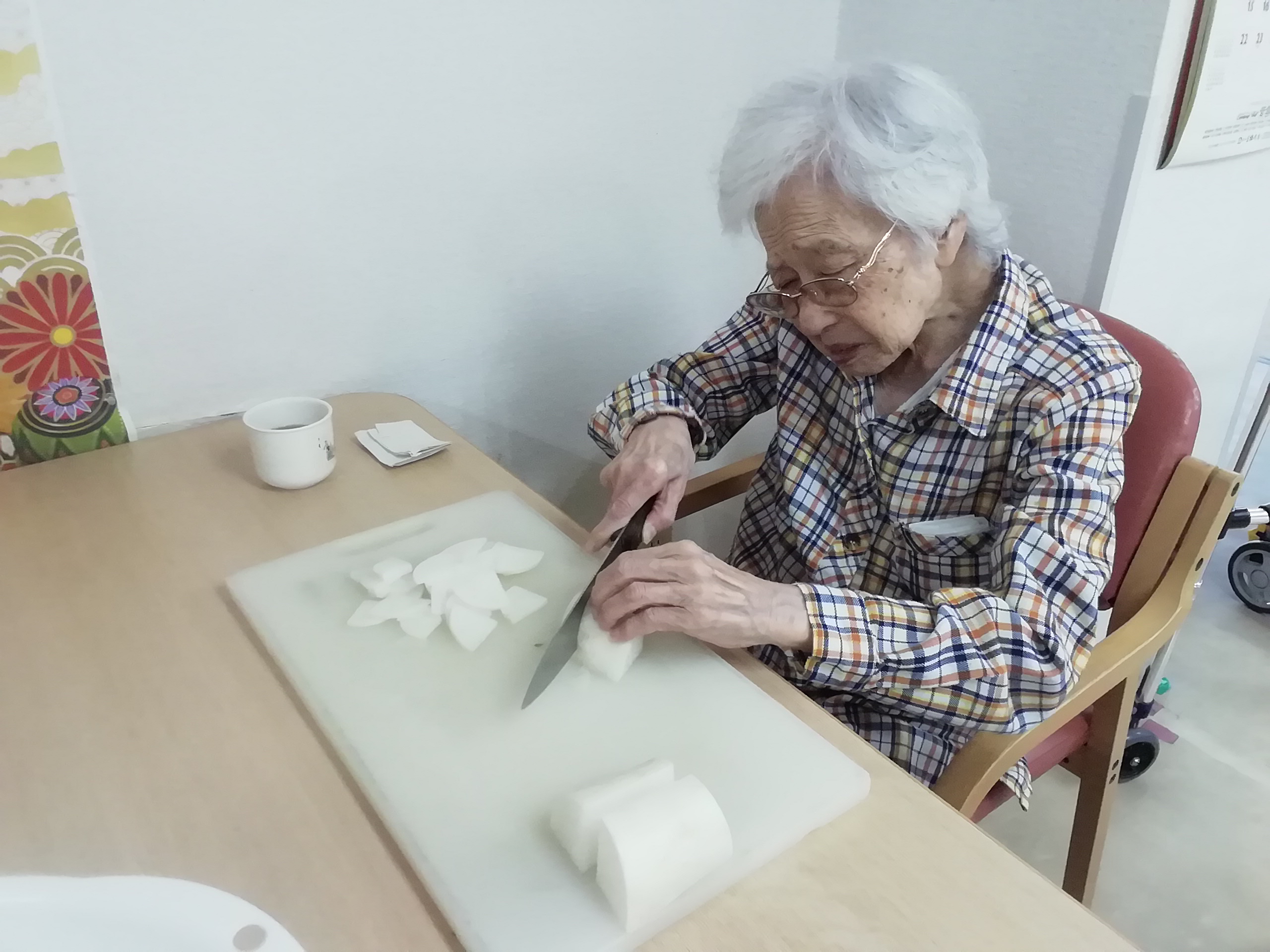 ゆうゆう畑で収穫した大根。先月はおでんを作り、今月は、豚汁を作りました。まずは、大根の収穫から見ていただきましょう。