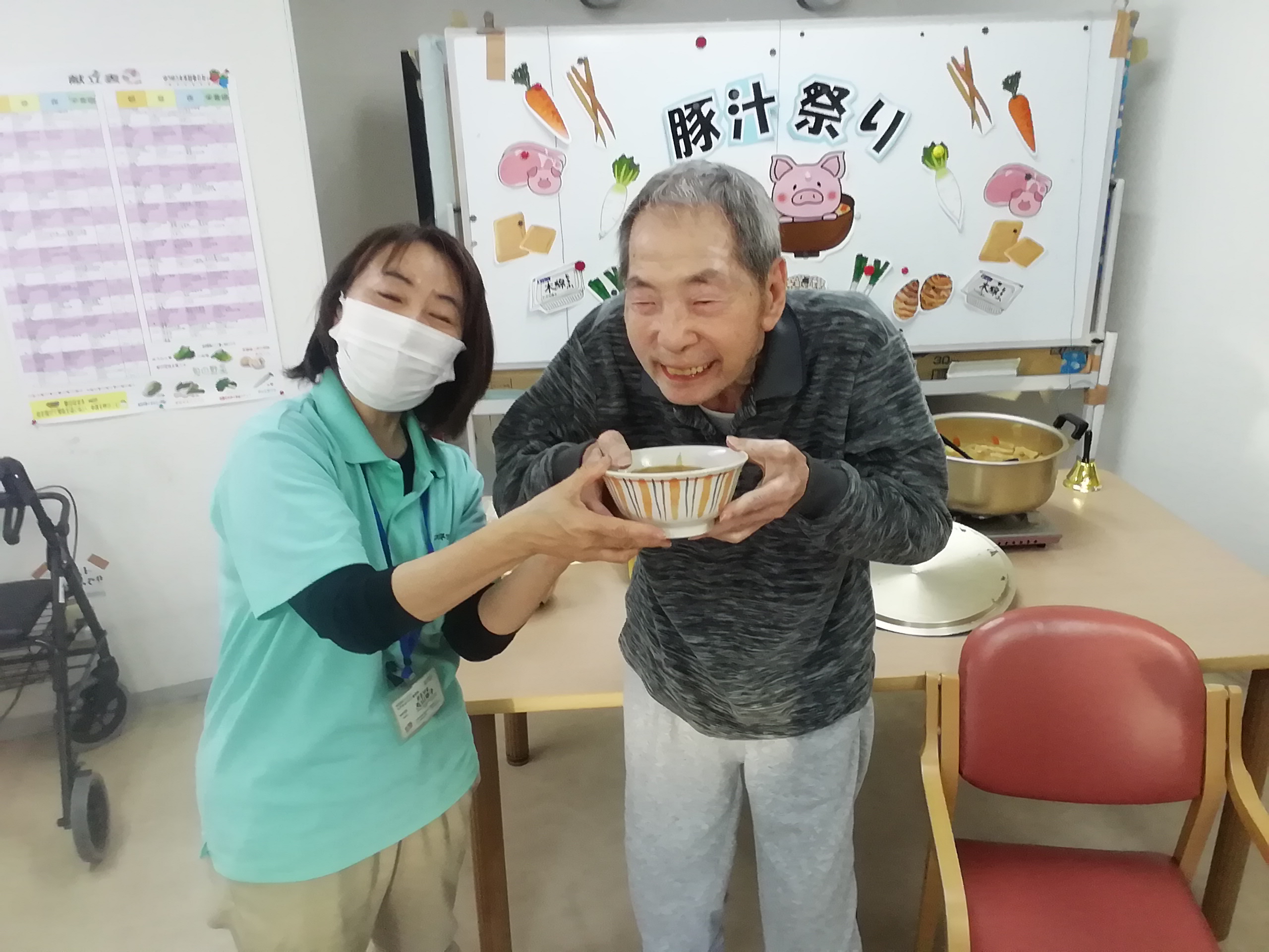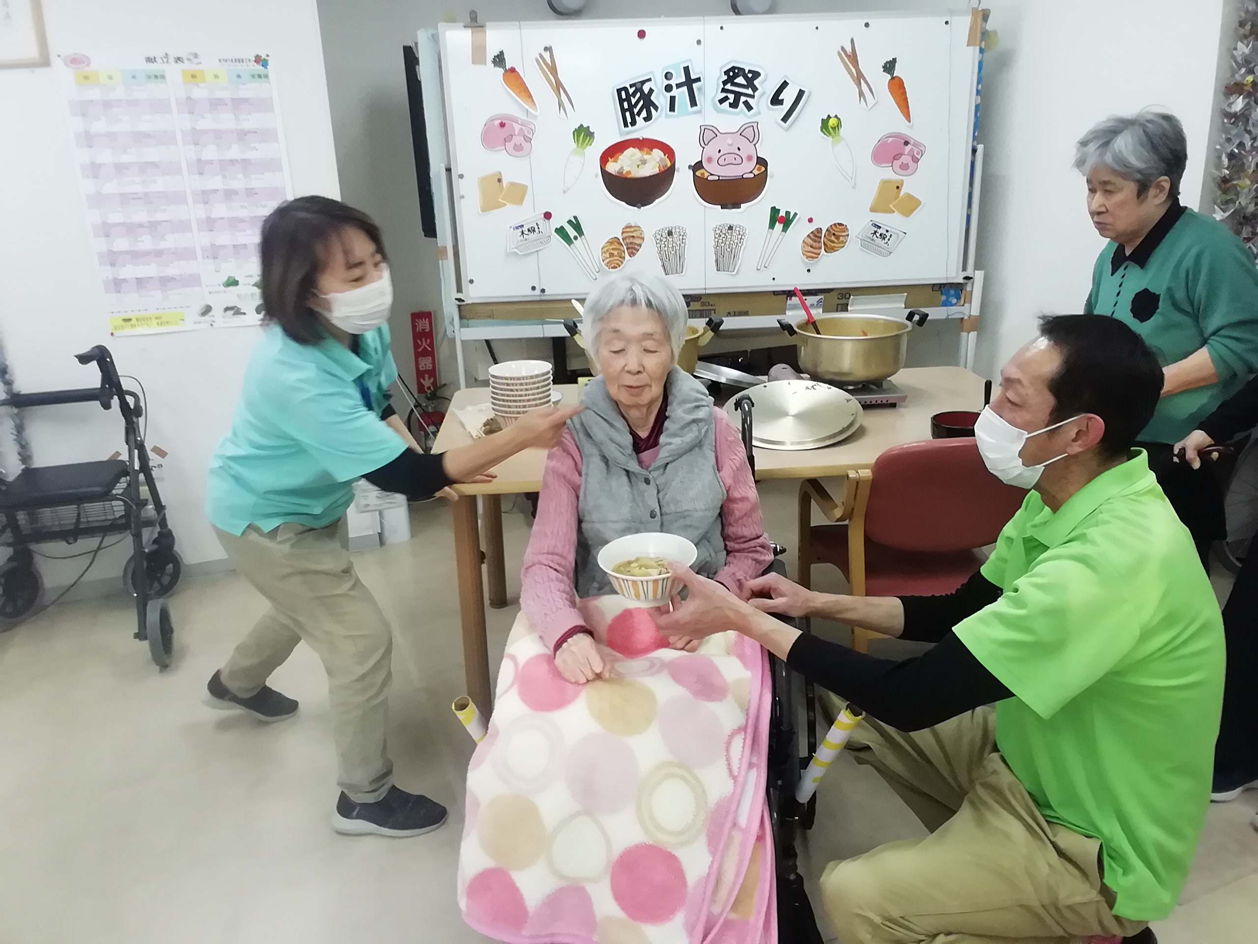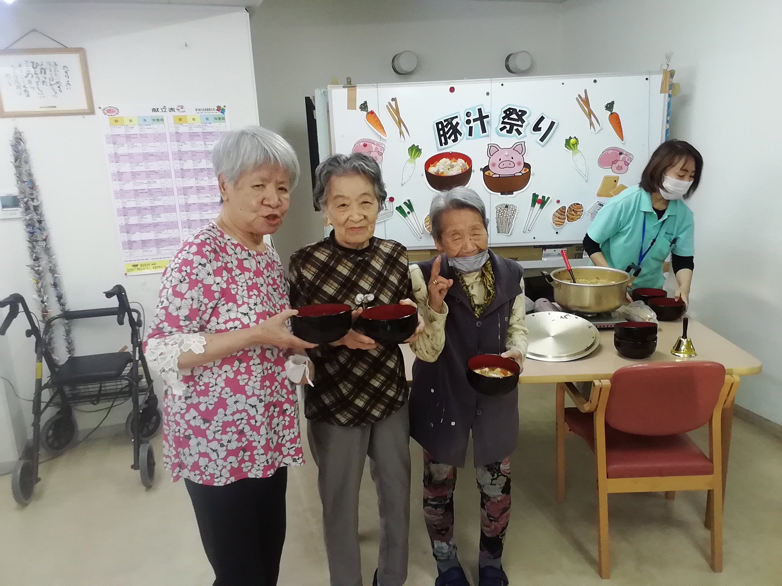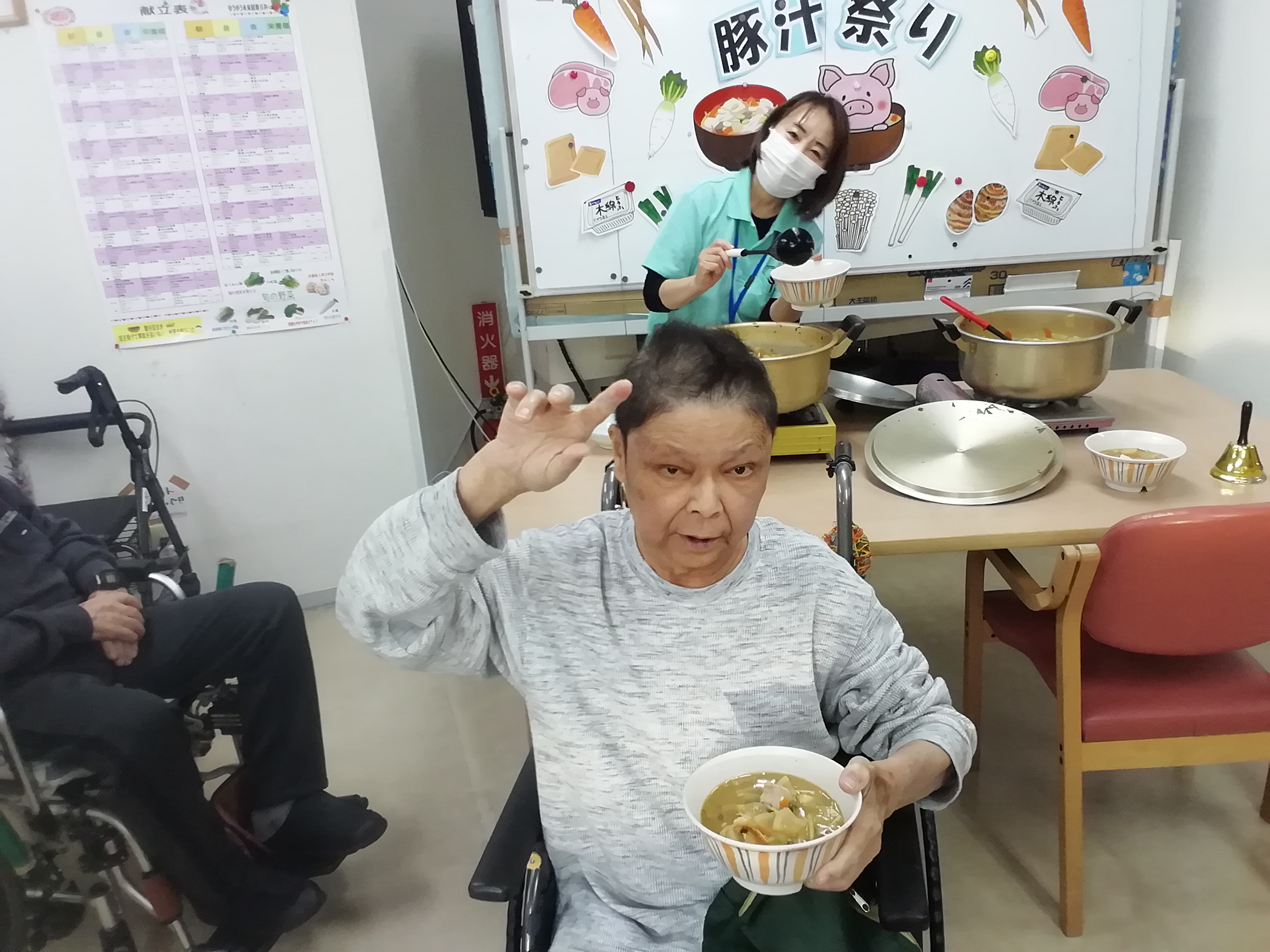 皆様に切っていただいた大根、葉っぱも入れて、美味しい豚汁ができますよ!