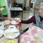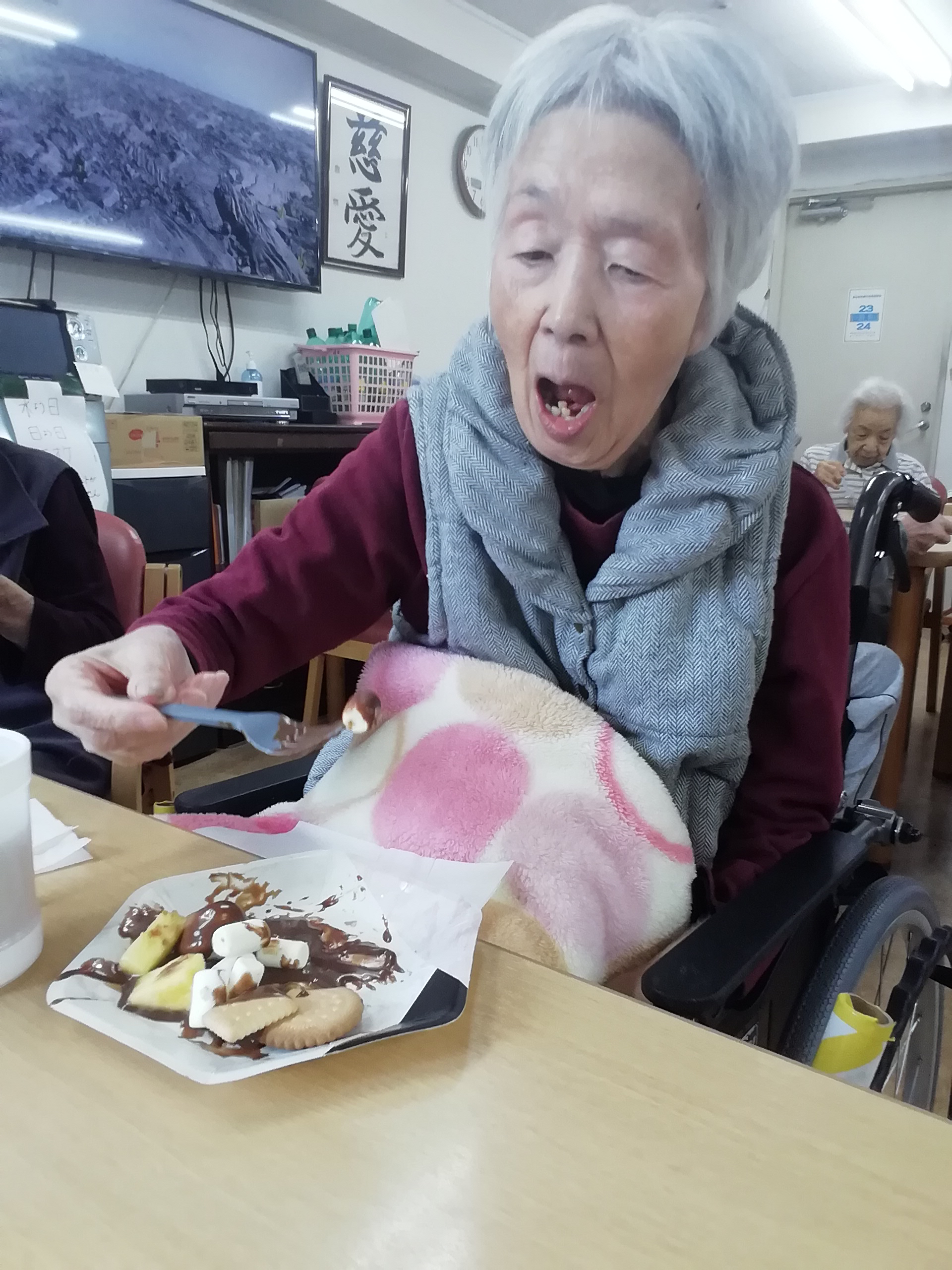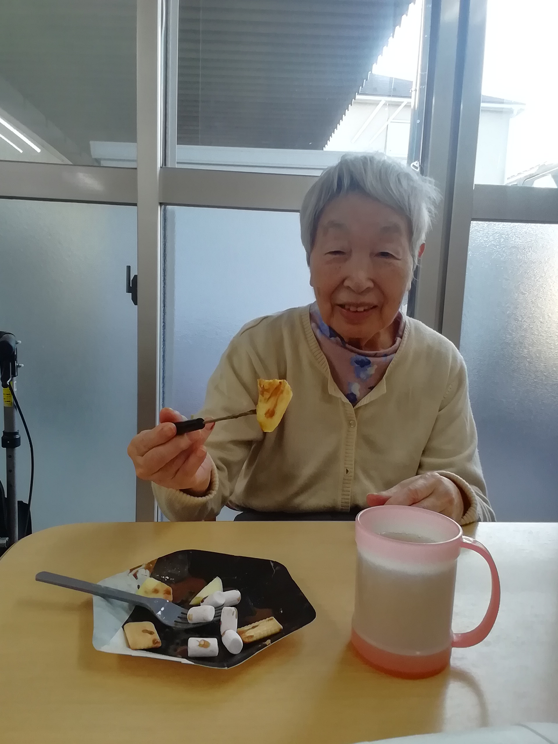 バナナやパイナップル、リンゴのフルーツやビスケット、マシュマロ、カステラを用意。