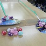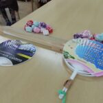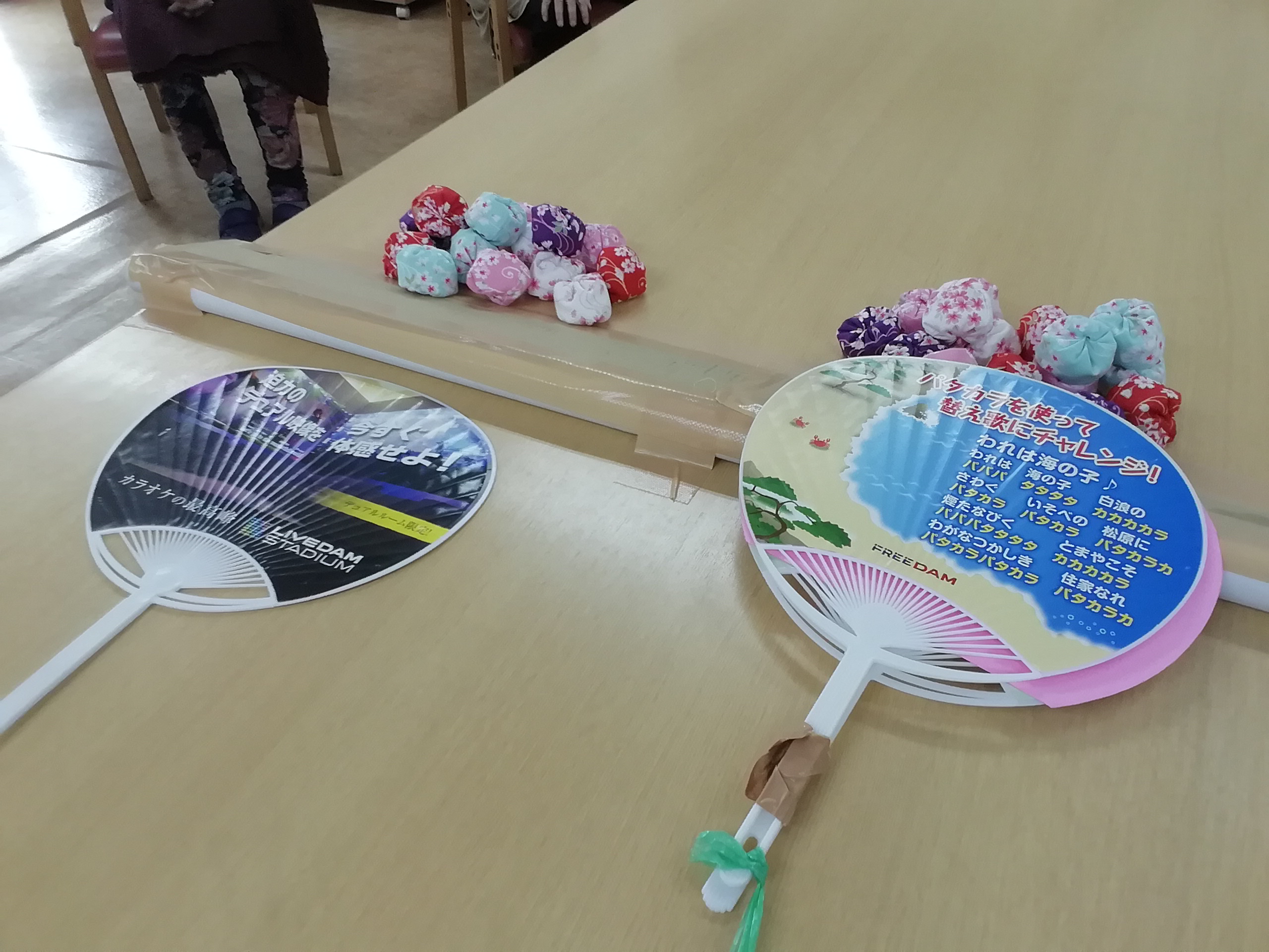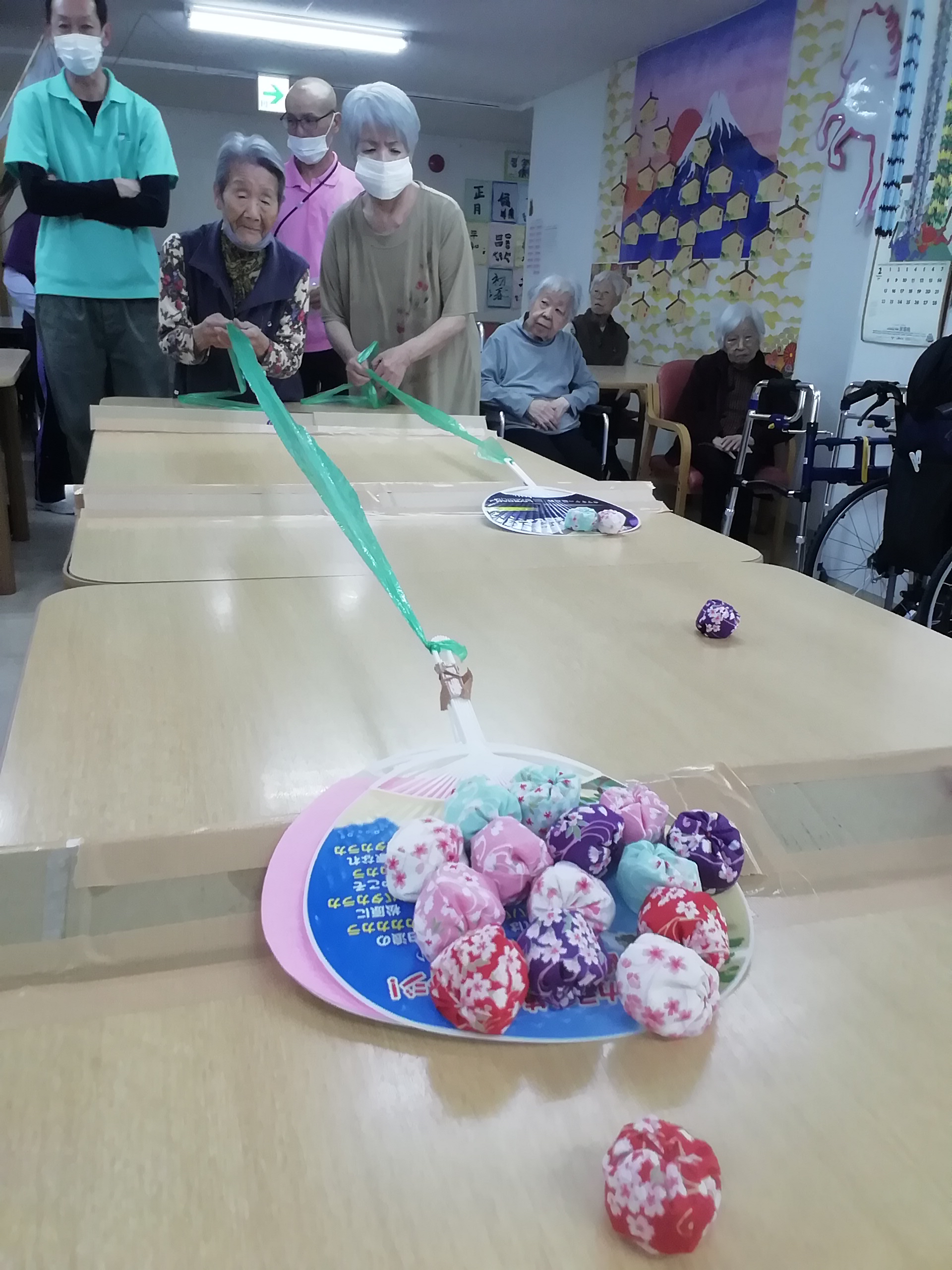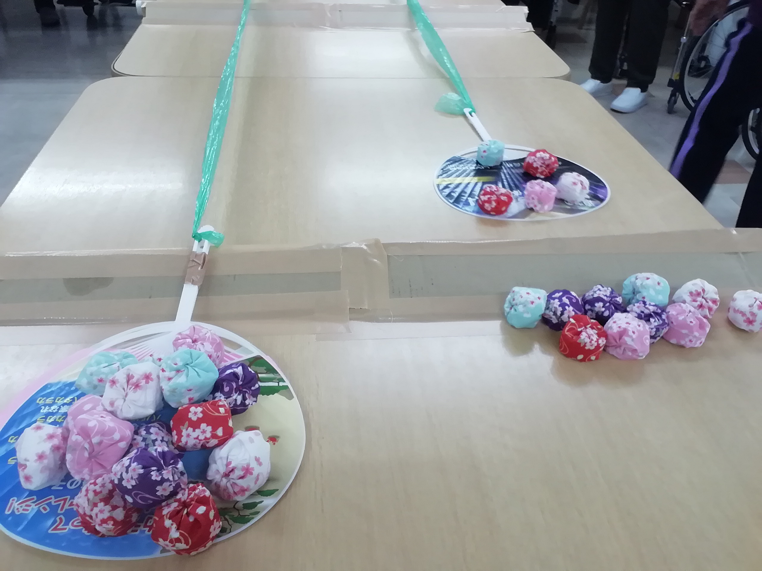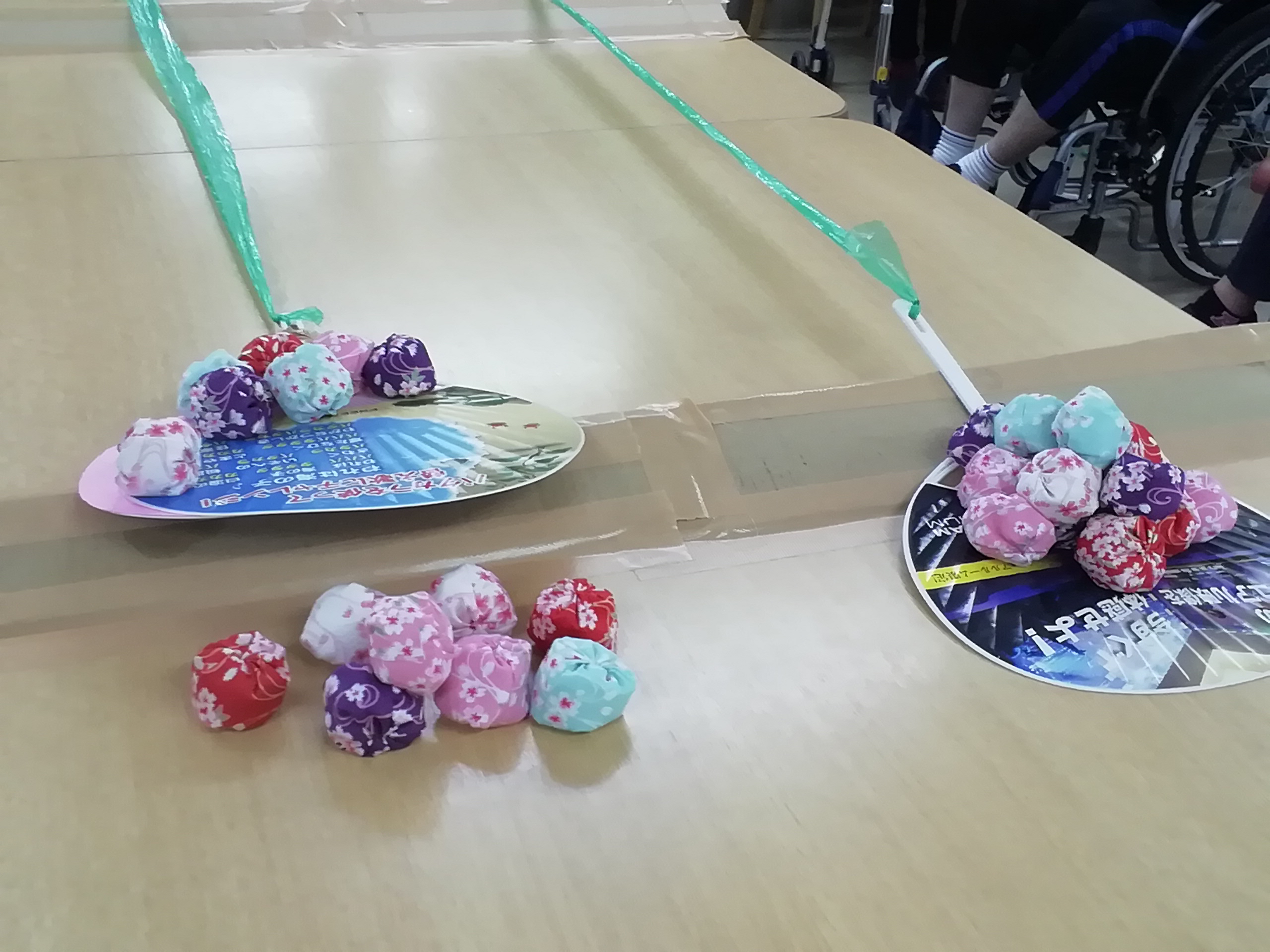 うちわに載せたお手玉をこぼさないように、紐を引いてくださいね。