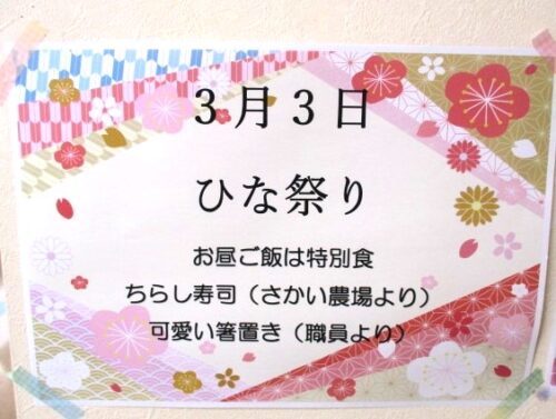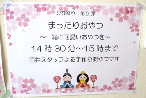 利用者様からも「ひな祭りのポスターをまた貼るの?え、違うのΣ(゚Д゚)?」と言われおやつもやりますよとお伝えした所、「やった~✨」と喜ばれていました。