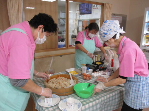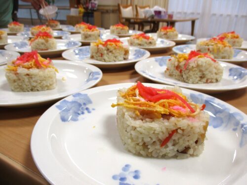 スタッフ何人かでちらし寿司をなんと「ひし形」の形にしていきます(⌒∇⌒)