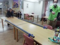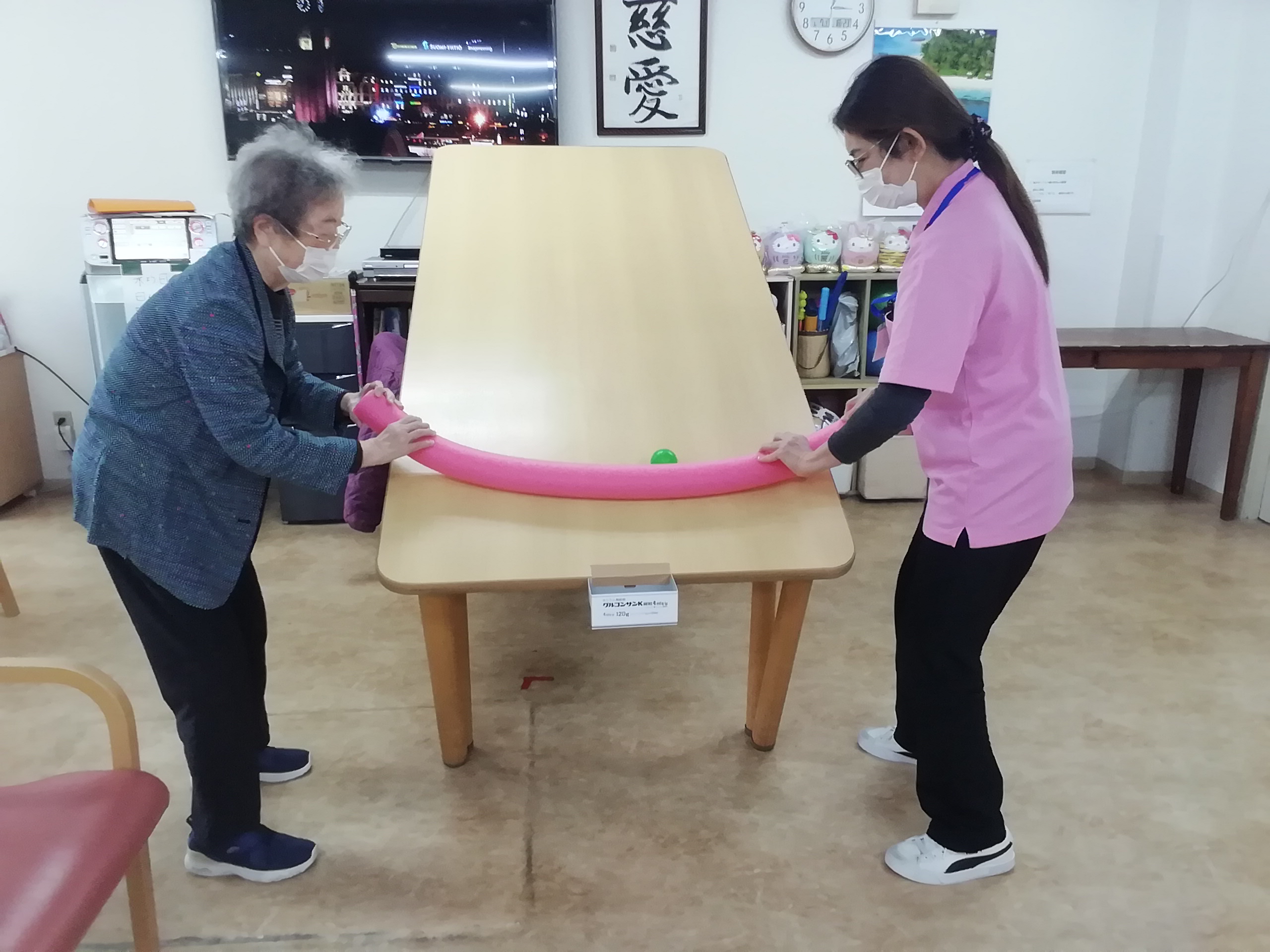 テーブルバランスゲームというのは、棒の両端を二人で持ち、小さなボールをゴールまで、転がしながら進めるゲームです。
